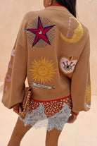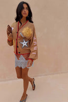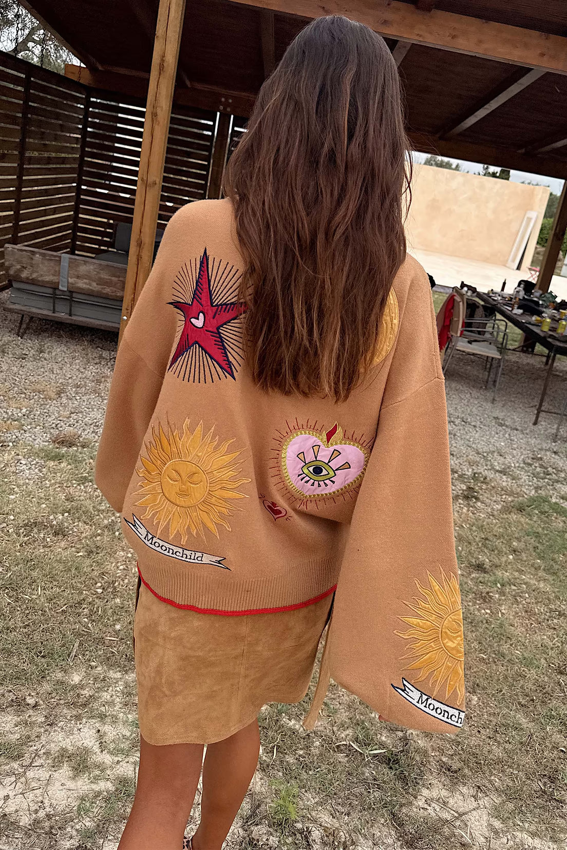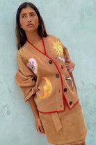 What truly sets it apart are the intricate embroidered motifs—delicately inspired by the gold and silver accents, sunbursts, and moon engravings found throughout the souks of Marrakech. A timeless piece with a story woven into every stitch.