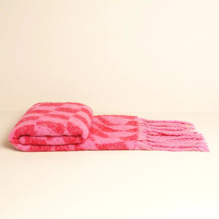 A super-soft, bold scarf in a striking pink and red design, featuring a curvy illusion-style pattern. Finished with thick matching tassels, it’s a standout accessory that adds a pop of colour to any outfit – perfect for retailers seeking eye-catching pieces.