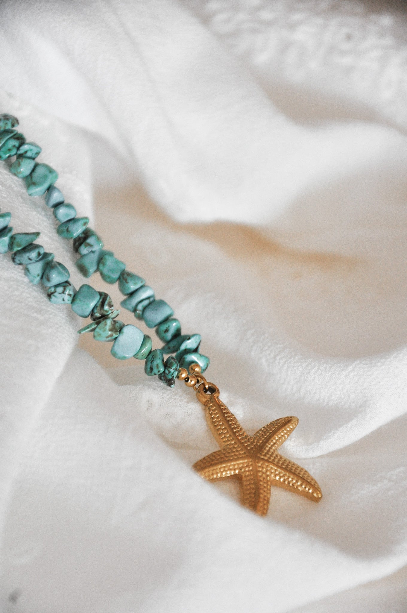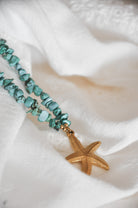 18k Gold Plated Starfish Pendant Necklace on Turquoise Stone Beaded Chain