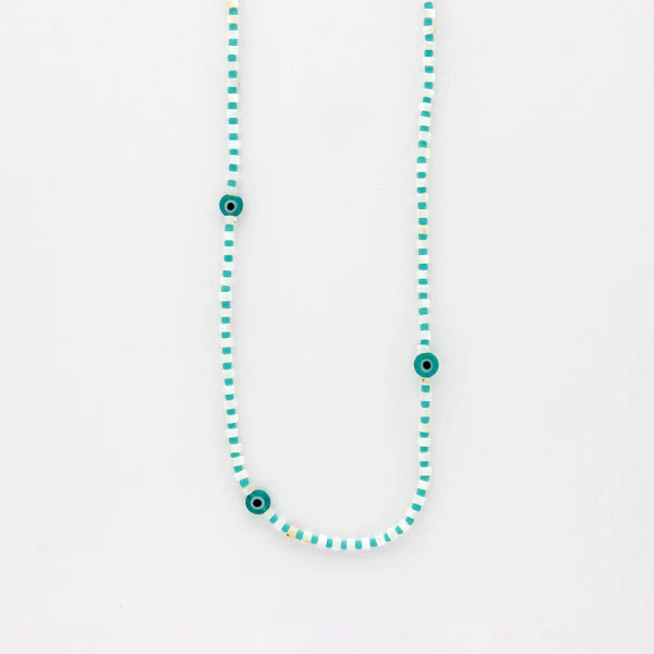 - Made with teal blue glass seed beads, glass evil eye charms and a wax polyester cord.