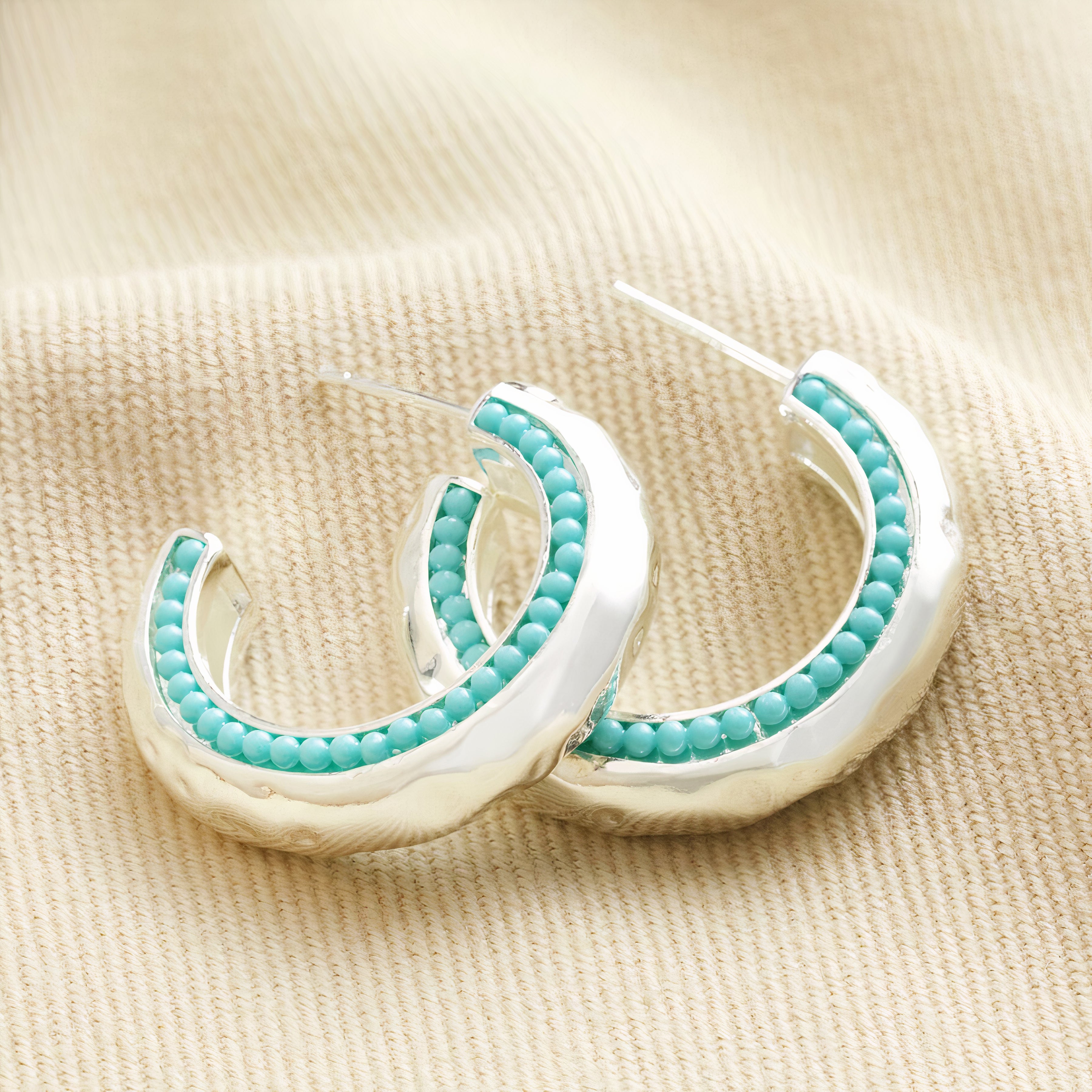 Add a splash of colour to your jewellery collection with these textured silver hoop earrings, finished with eye-catching teal stones along the edge.