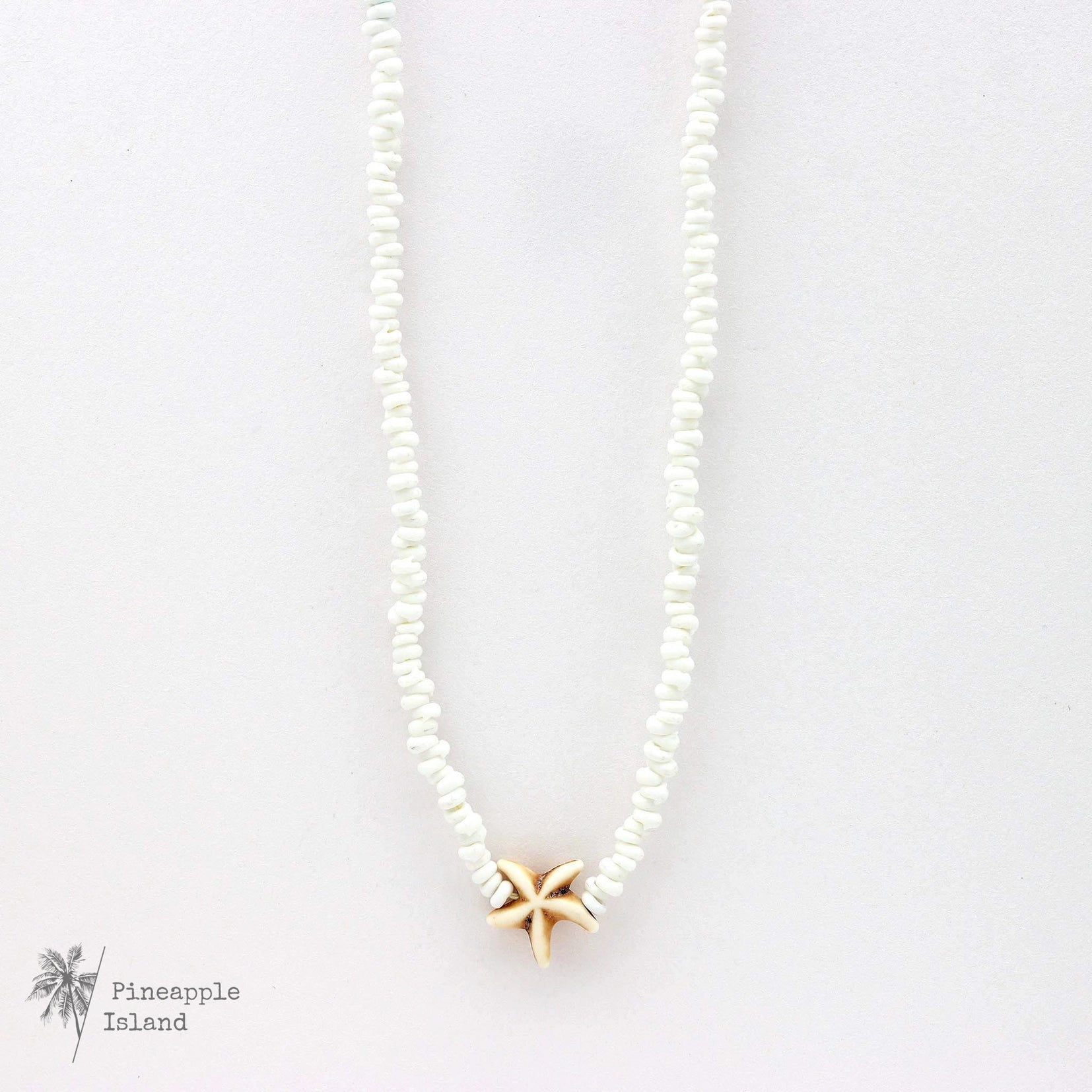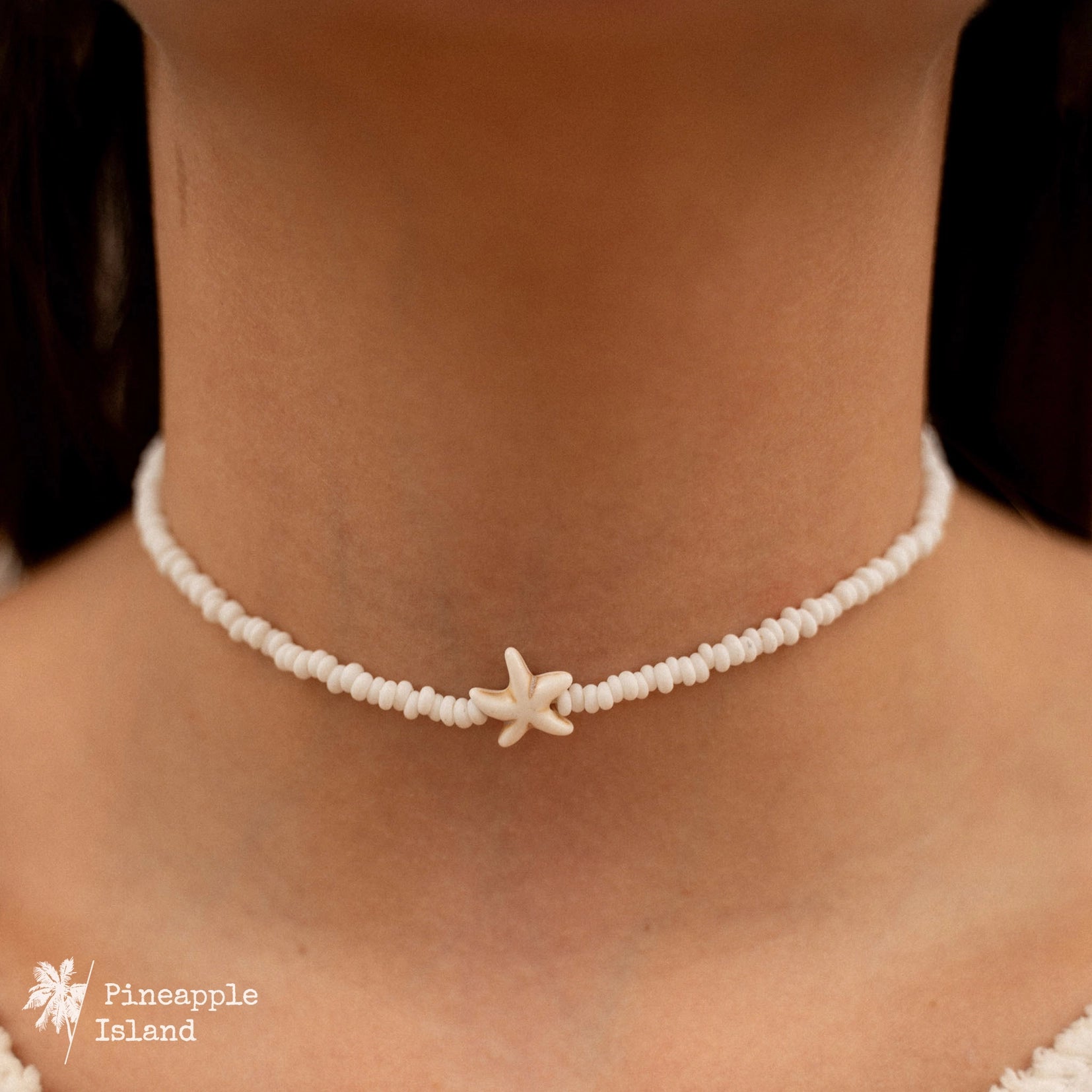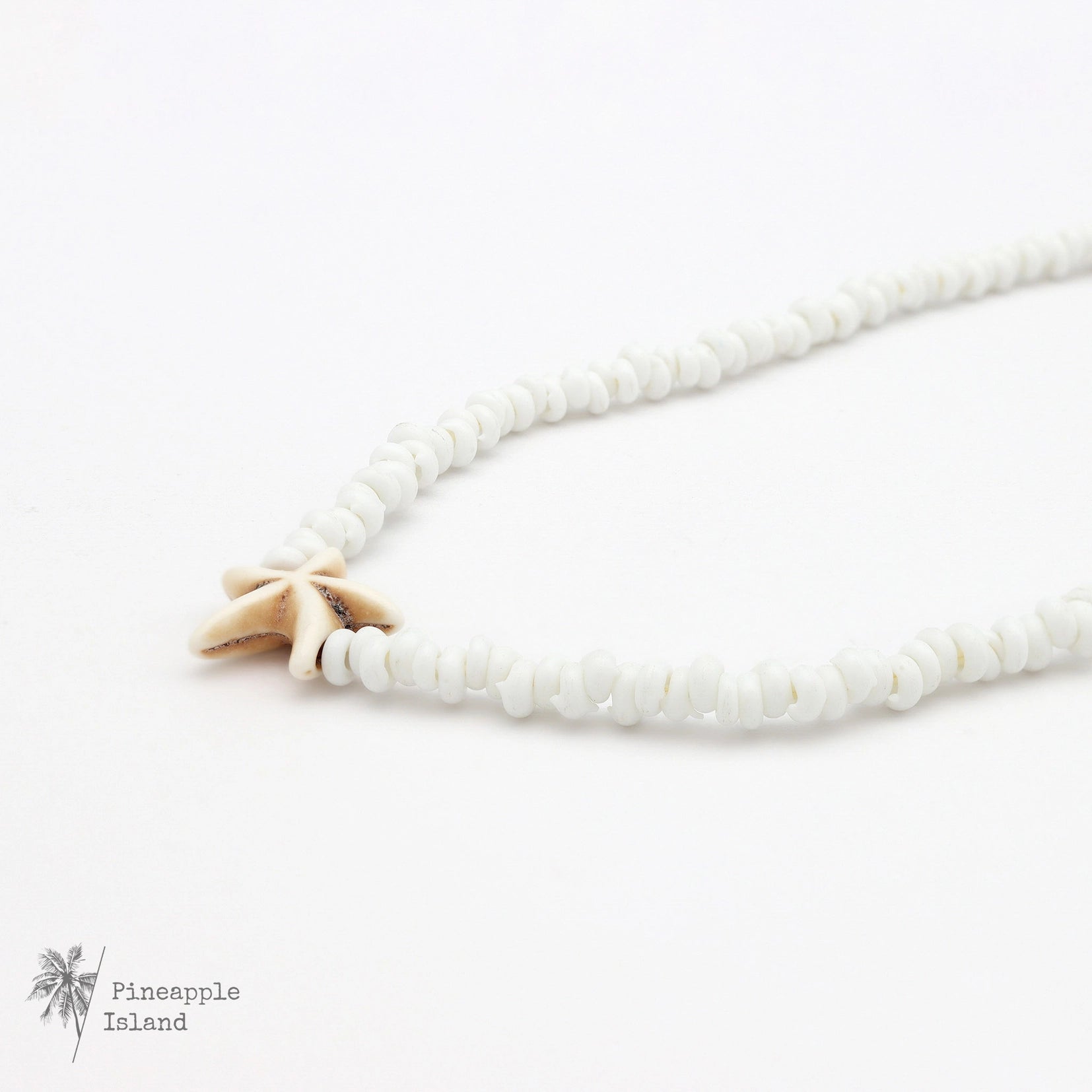 Crafted with irregular shell beads, waxed polyester cord, and a glass starfish charm