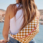 Add a playful touch to your everyday look with this checkerboard crossbody bag in fun caramel and ecru tones. Designed in an adult size and made from 100% cotton, it’s both lightweight and durable—ideal for carrying your essentials in style.