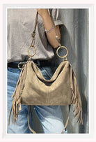 Elevate your everyday style with this soft suede bag in a timeless taupe shade. Designed with playful side fringing, it features a secure top zip closure and an internal zip pocket to keep your essentials organized. The bag comes with two interchangeable straps — a sleek leather shoulder strap and a matching suede cross-body strap — allowing you to switch effortlessly between looks.