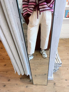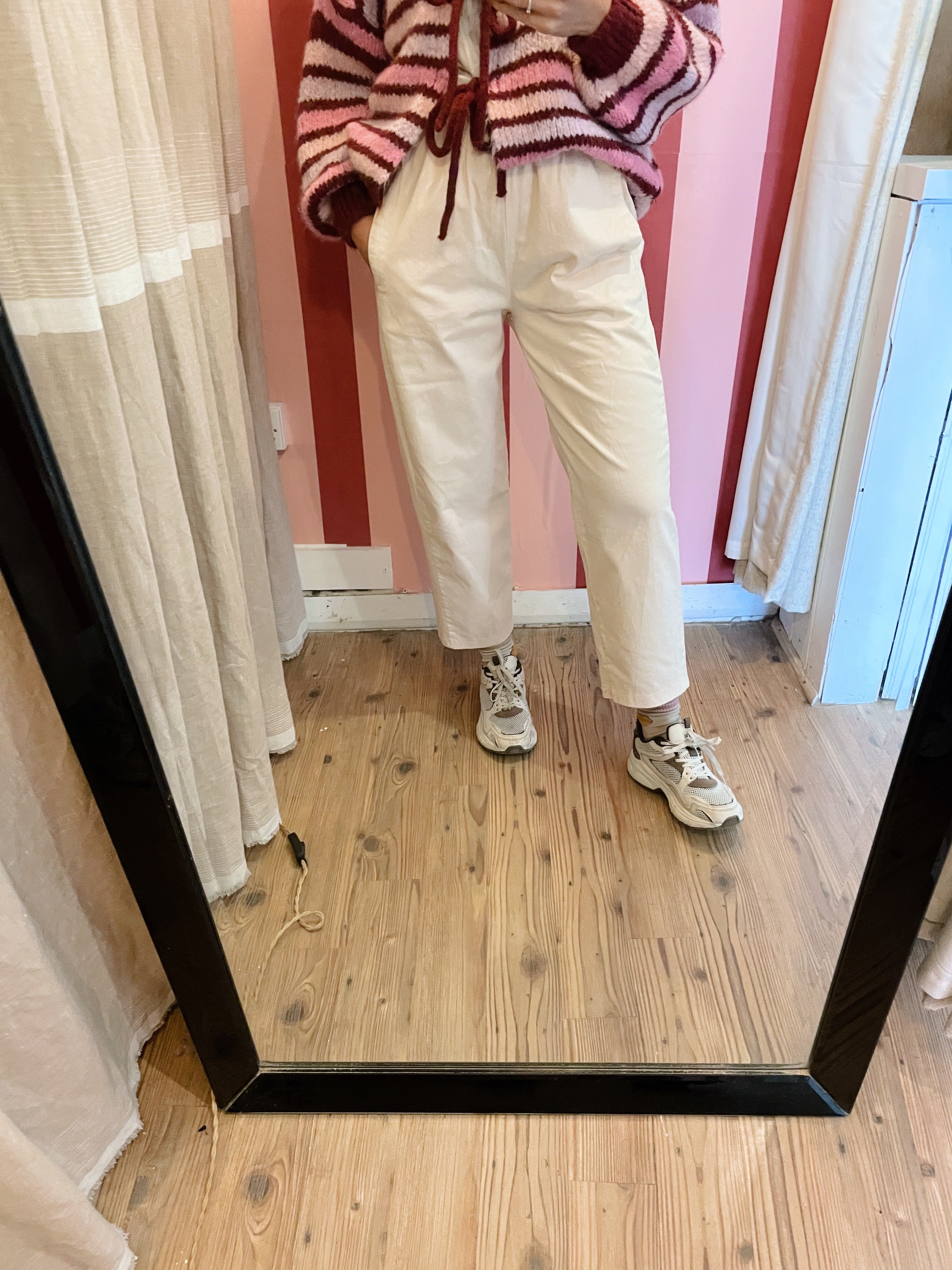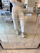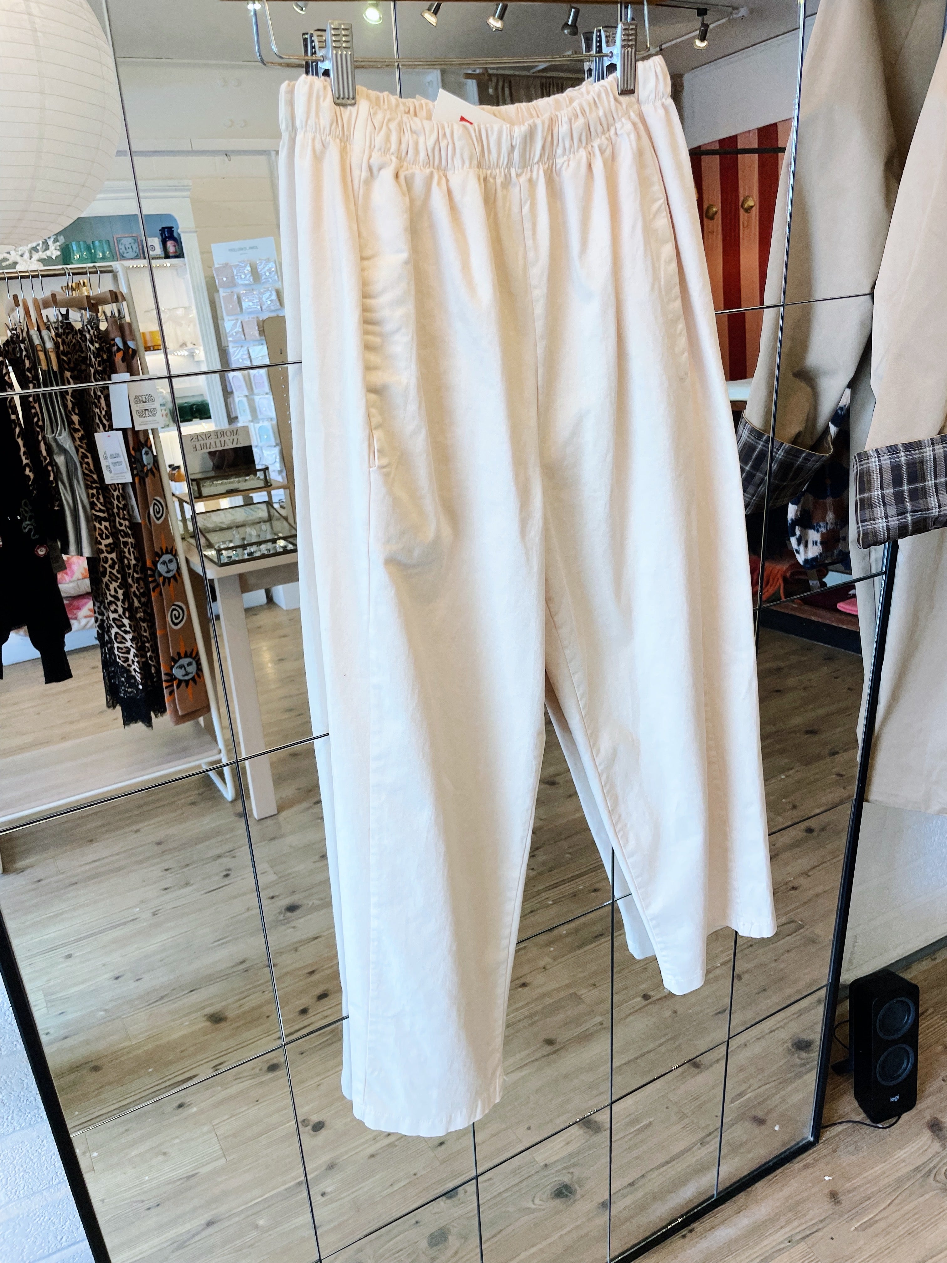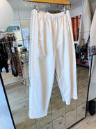Effortlessly chic and endlessly versatile, these ecru trousers are a wardrobe essential. Designed with a flattering high waist and an elasticated waistband, they offer both comfort and style in one easy fit — perfect for sizes 8 to 12. The relaxed silhouette makes them ideal for pairing with your favourite knit or layering up for a laid-back yet refined look.