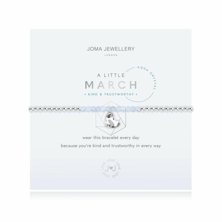 For all March babies, our lovely 'A Little' bracelet radiates birthstone beauty with special aqua crystal stones and a gently hammered silver heart charm.
