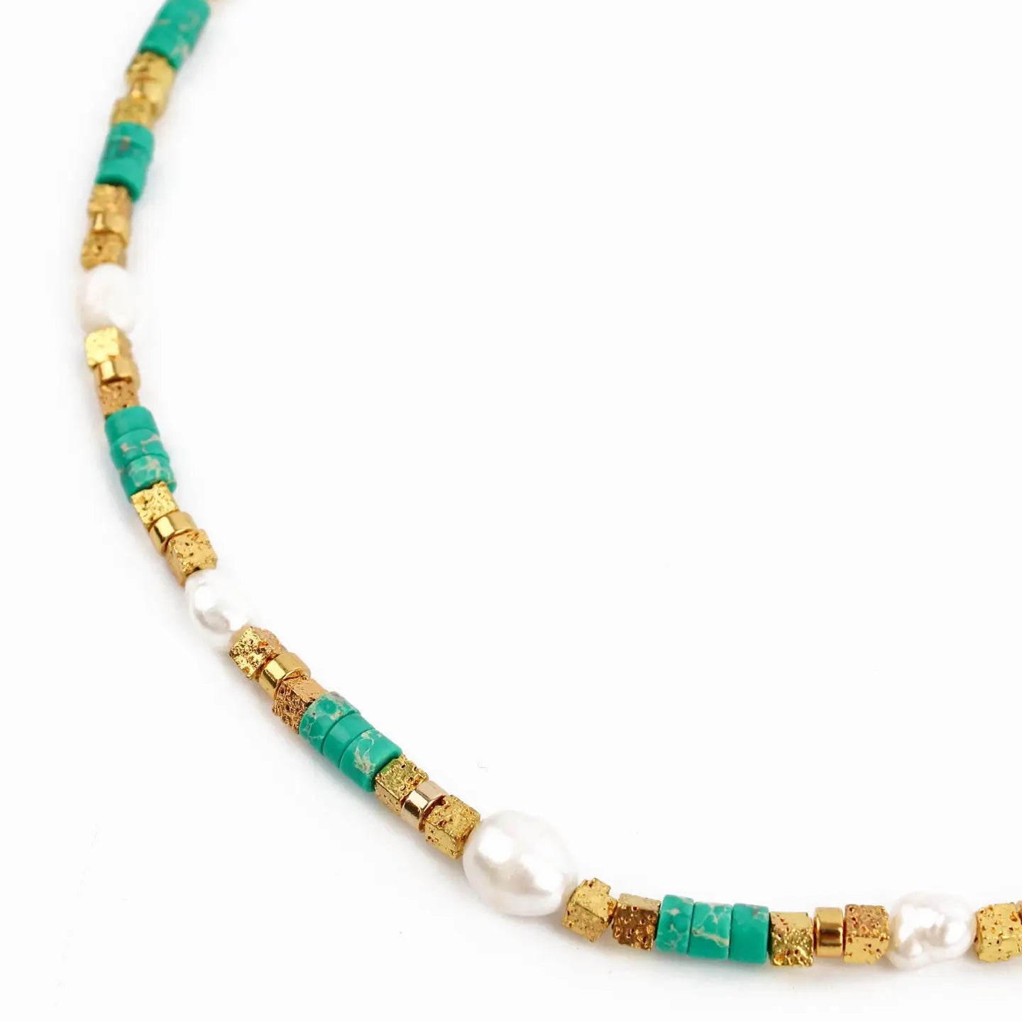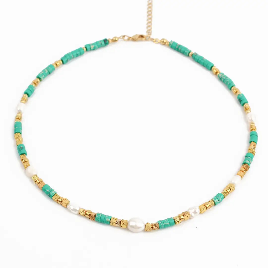 Brighten your everyday look with this perfect dopamine necklace, designed to bring a joyful pop of colour to any outfit. Strung with an eye-catching mix of green beads, lustrous freshwater pearls, and polished gold cubes, it’s an effortless statement piece that’s ideal for layering or wearing on its own.