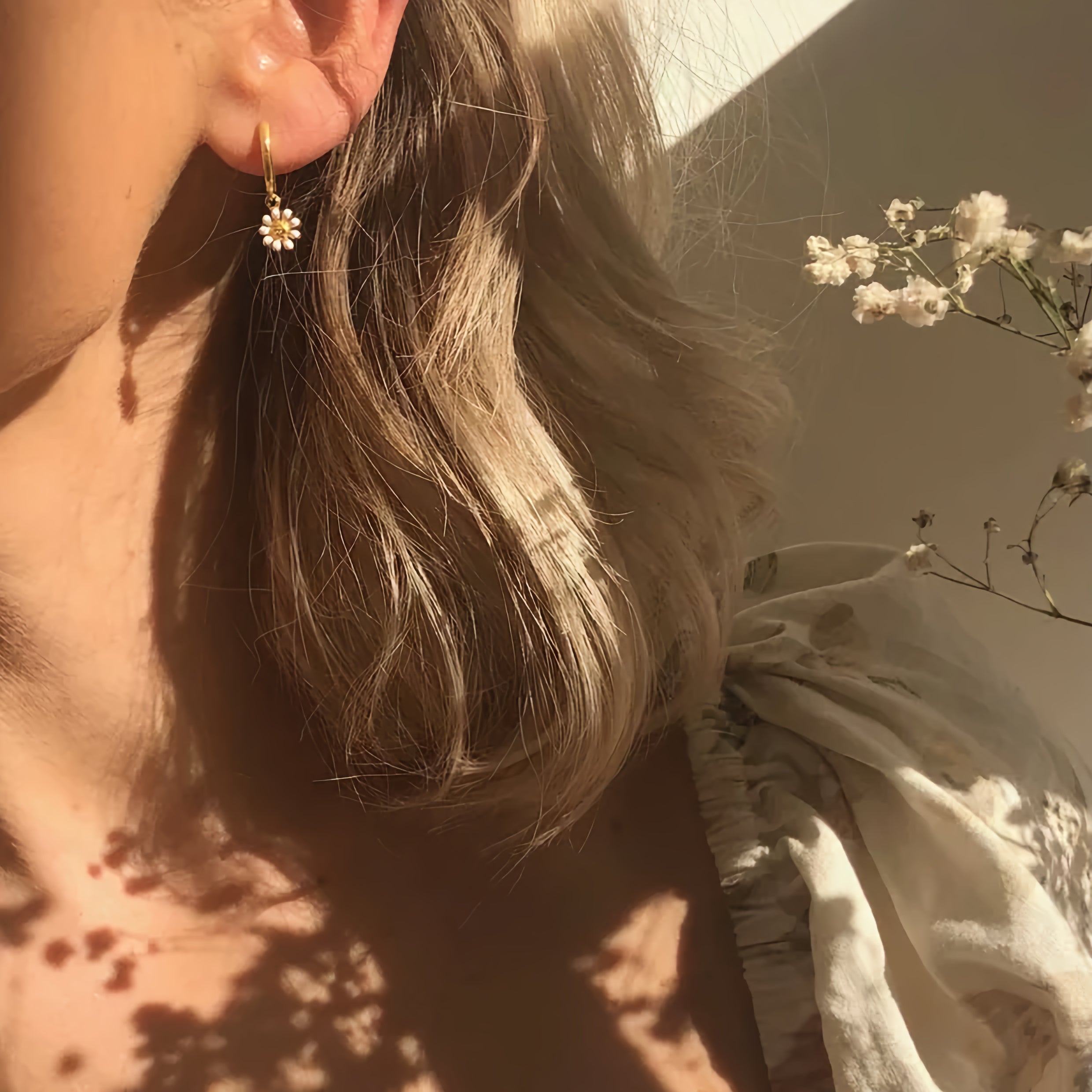 Each earring features a small, polished gold-plated hoop paired with a dainty enamel-coated flower charm, creating a playful and elegant look. Made from 14ct gold-plated brass, they are ideal for lovers of gold jewellery who want to embrace the boho-chic trend.