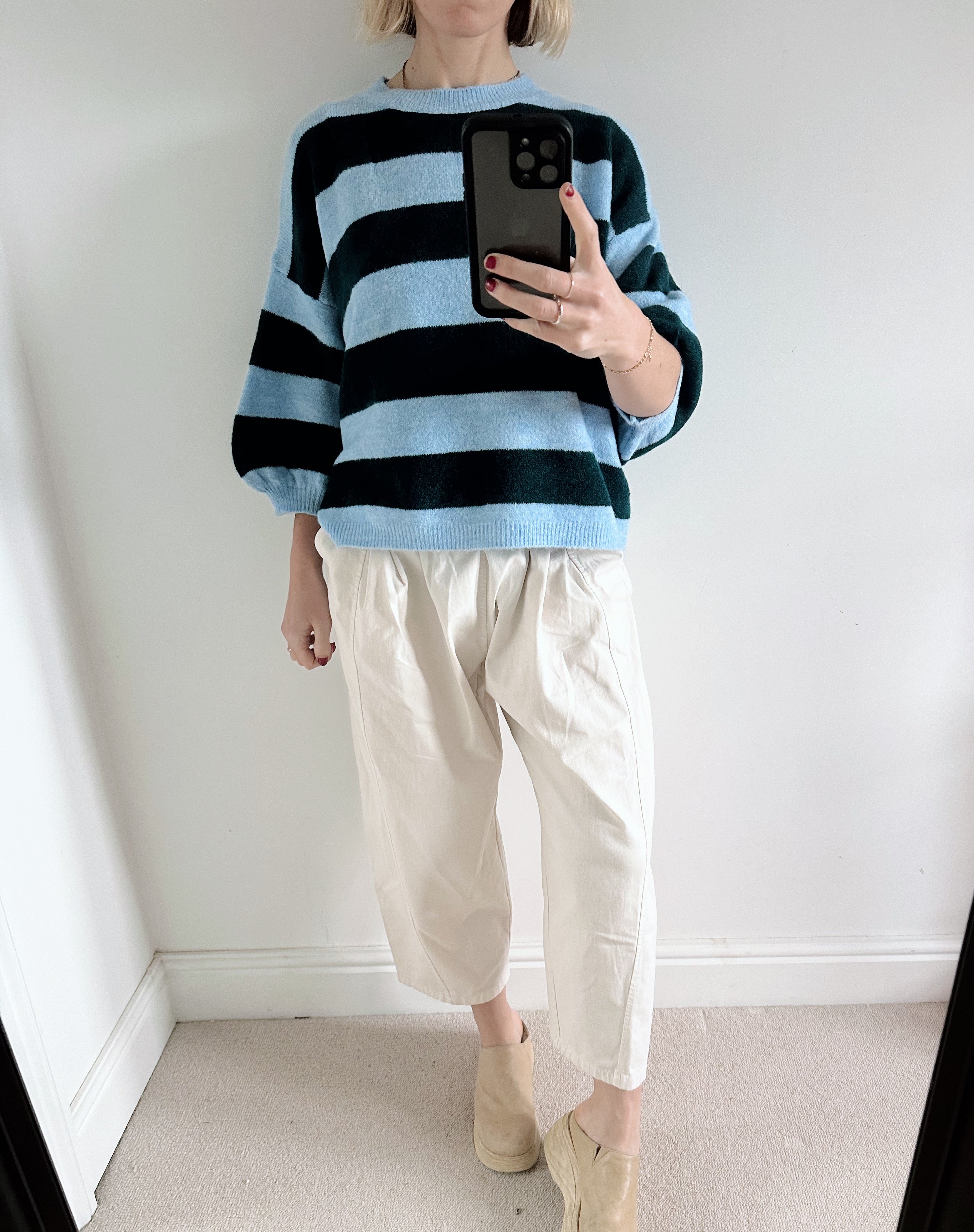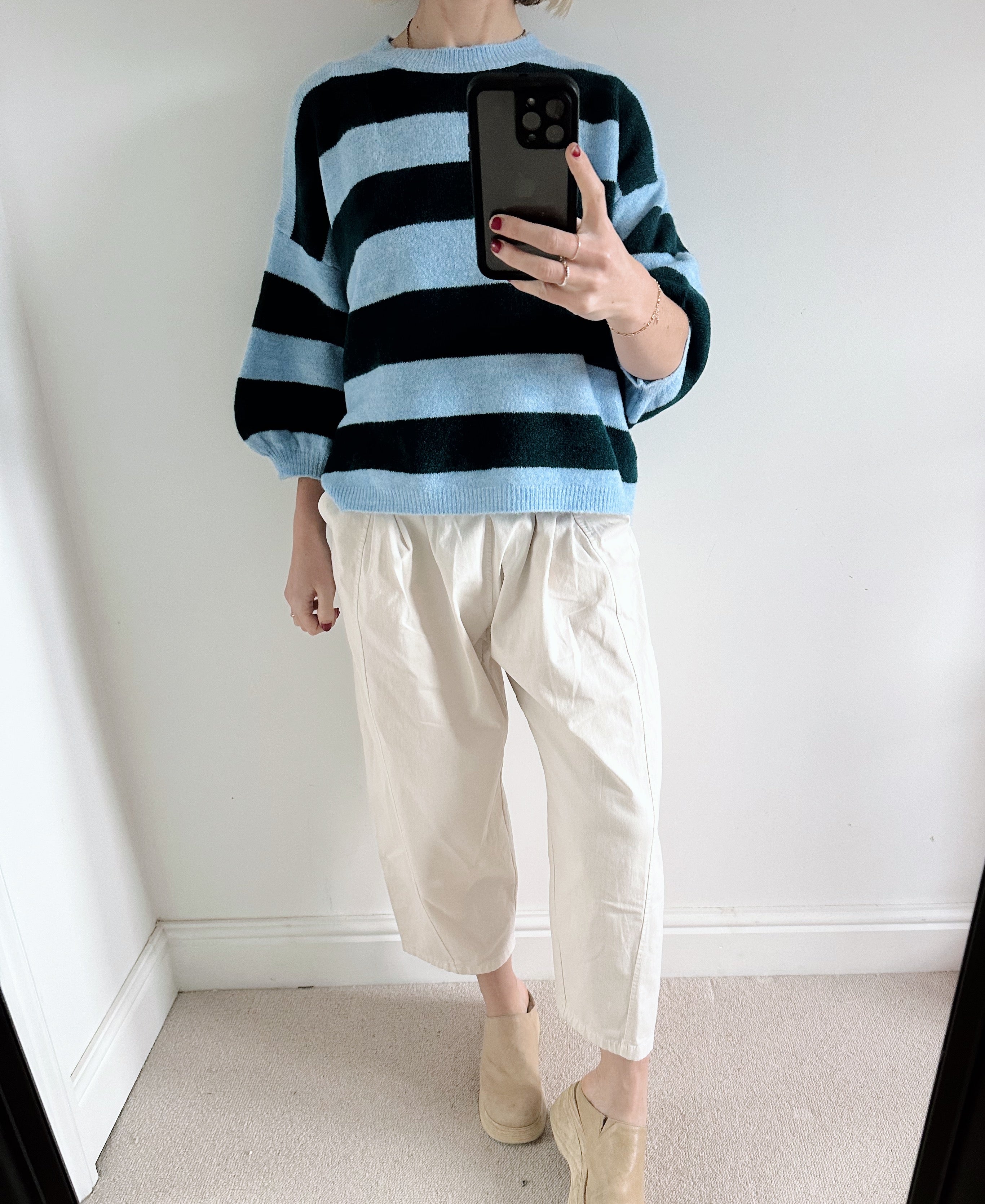 Blue Striped Knit Sweater with Balloon Sleeves