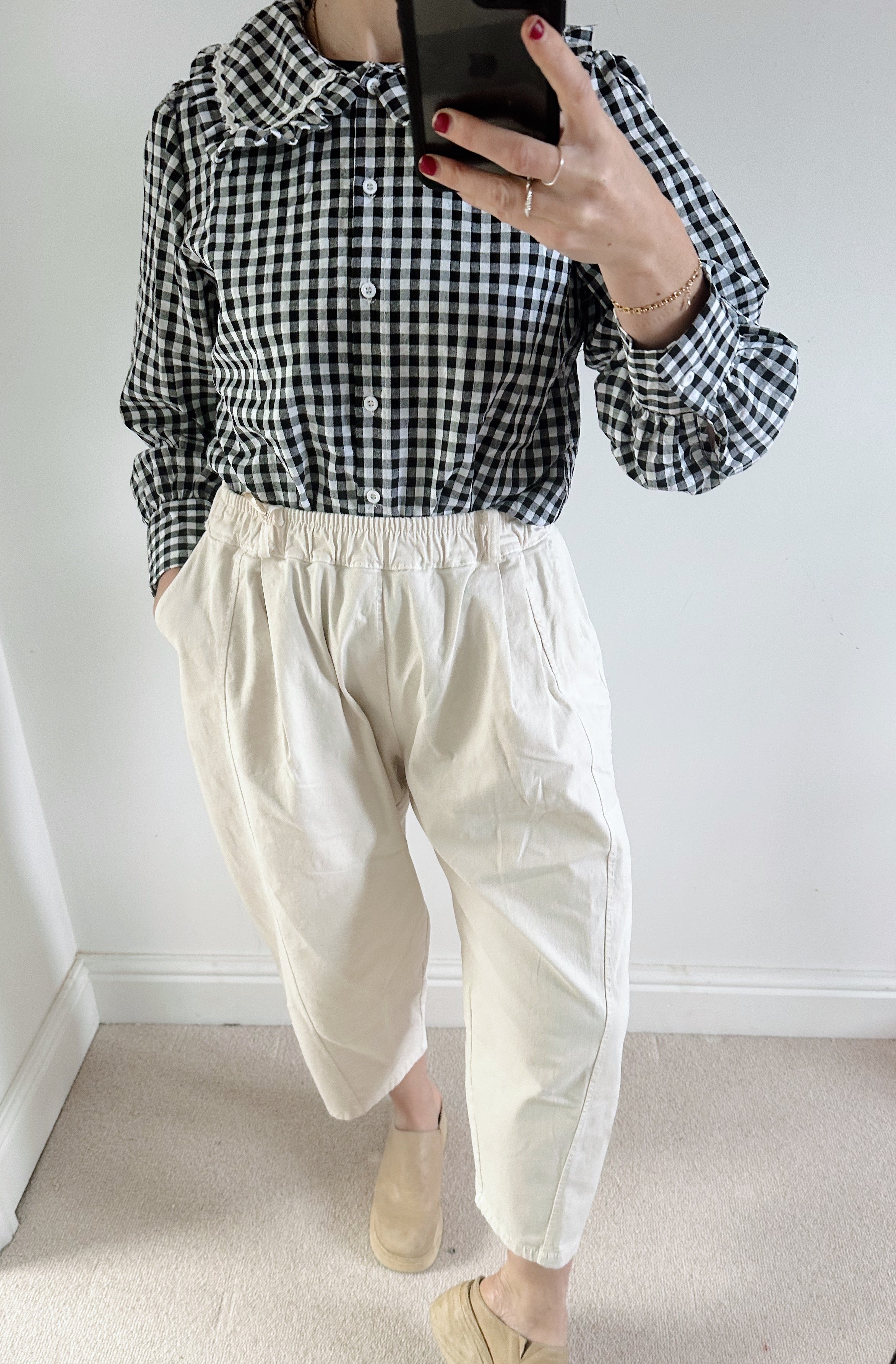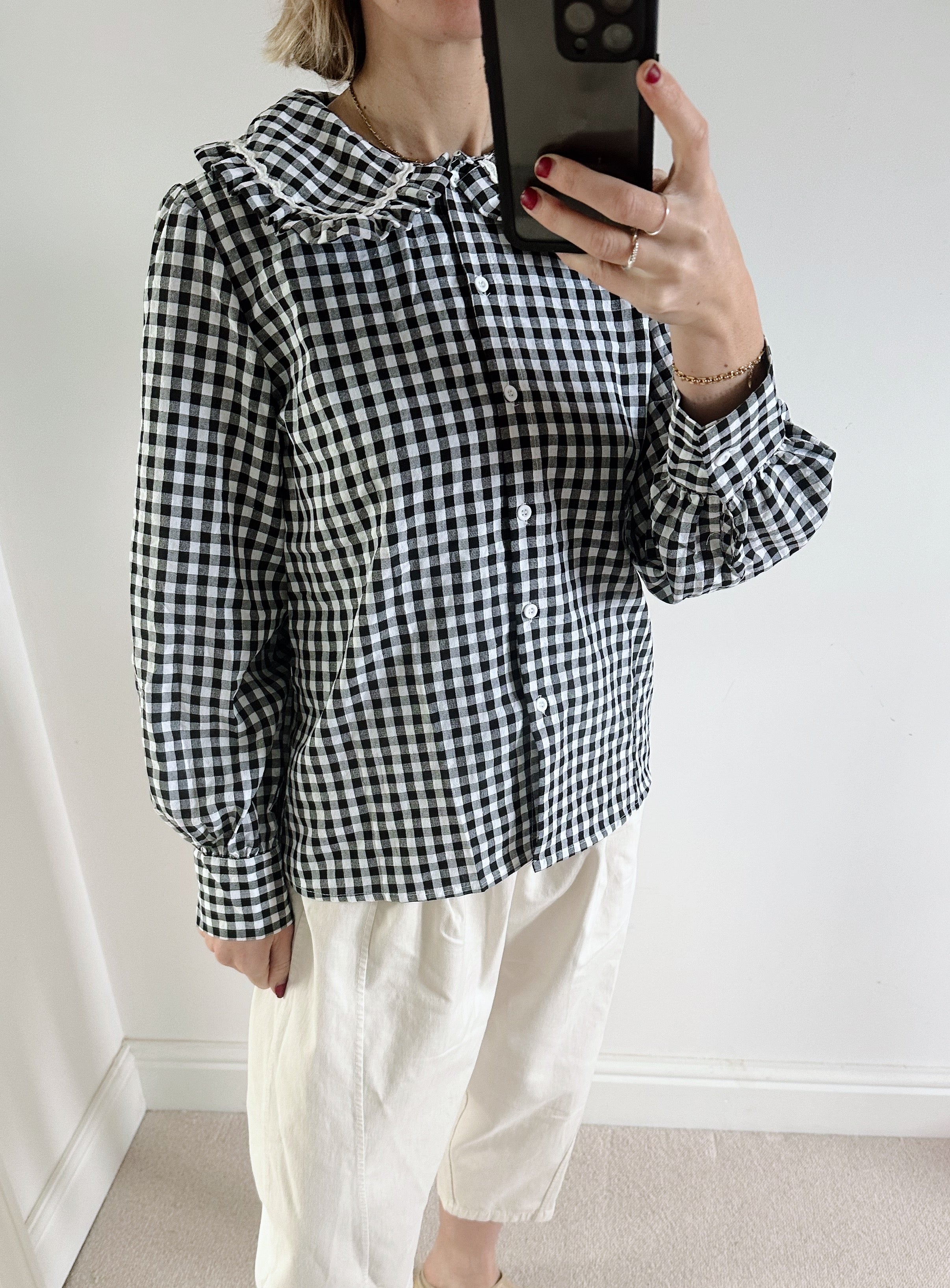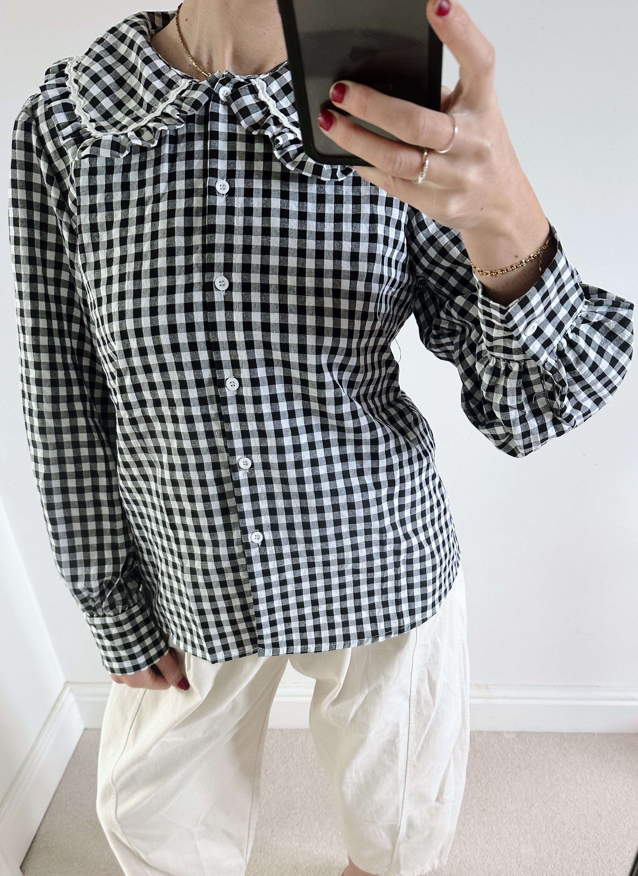 A timeless wardrobe staple with a sweet twist. This black and white gingham check shirt features a classic button-up front and a charming Peter Pan collar, making it perfect for effortless everyday styling.