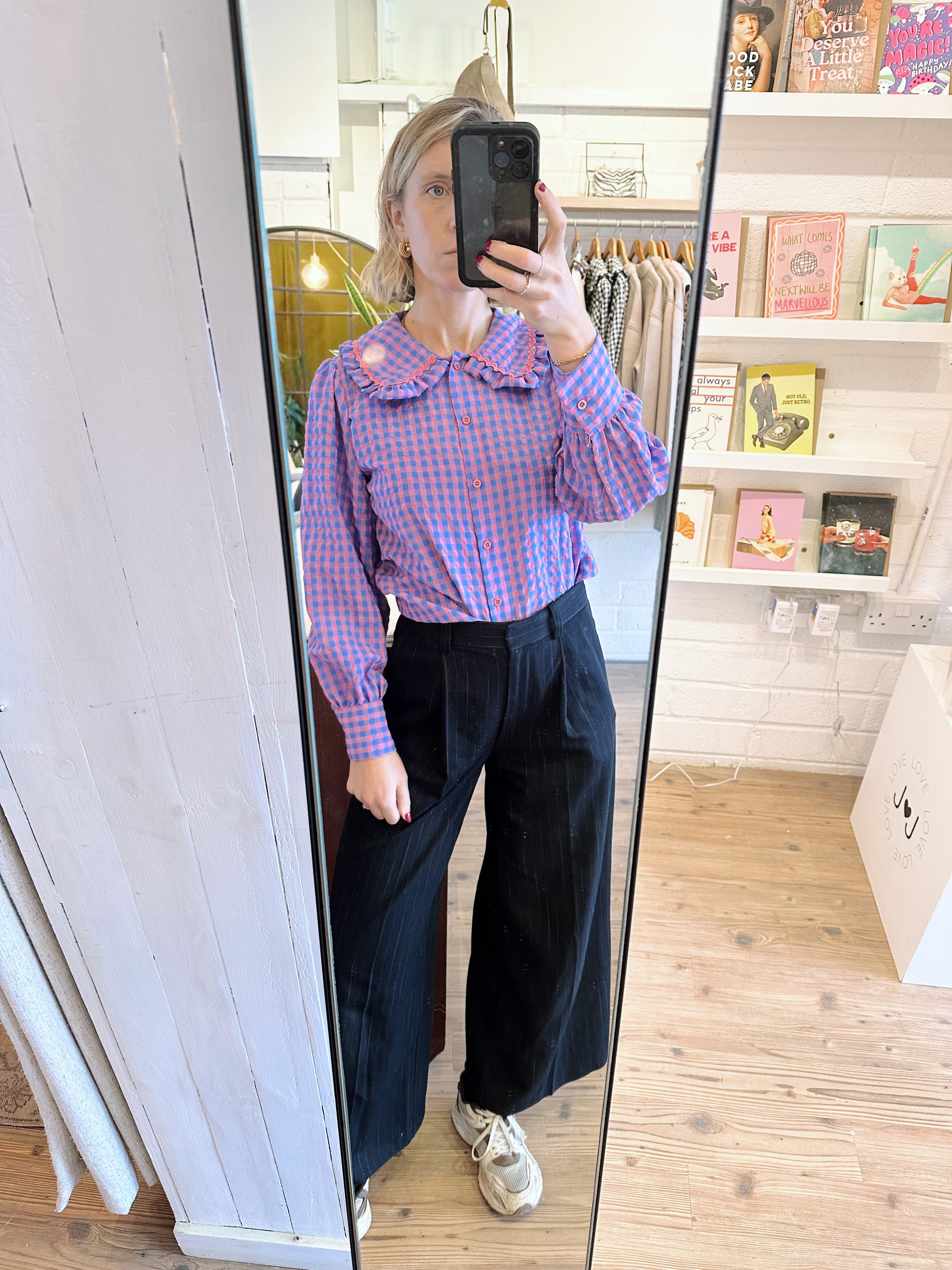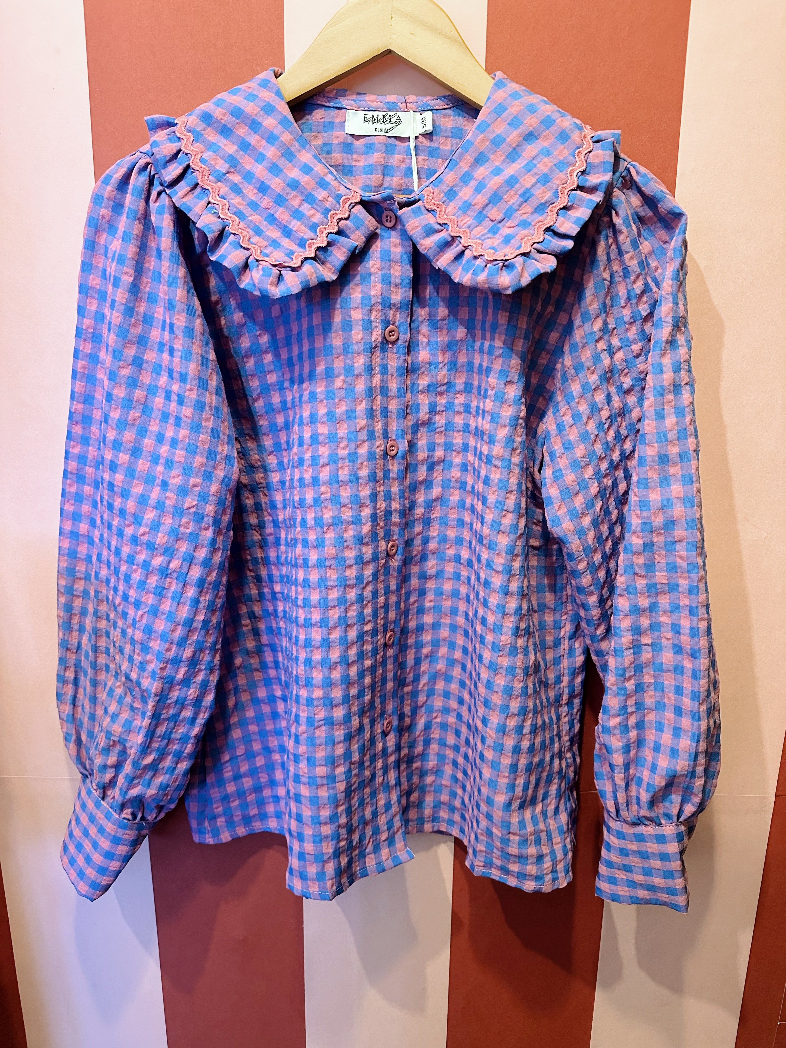 A timeless wardrobe staple with a sweet twist. This blue and pink gingham check shirt features a classic button-up front and a charming Peter Pan collar, making it perfect for effortless everyday styling.