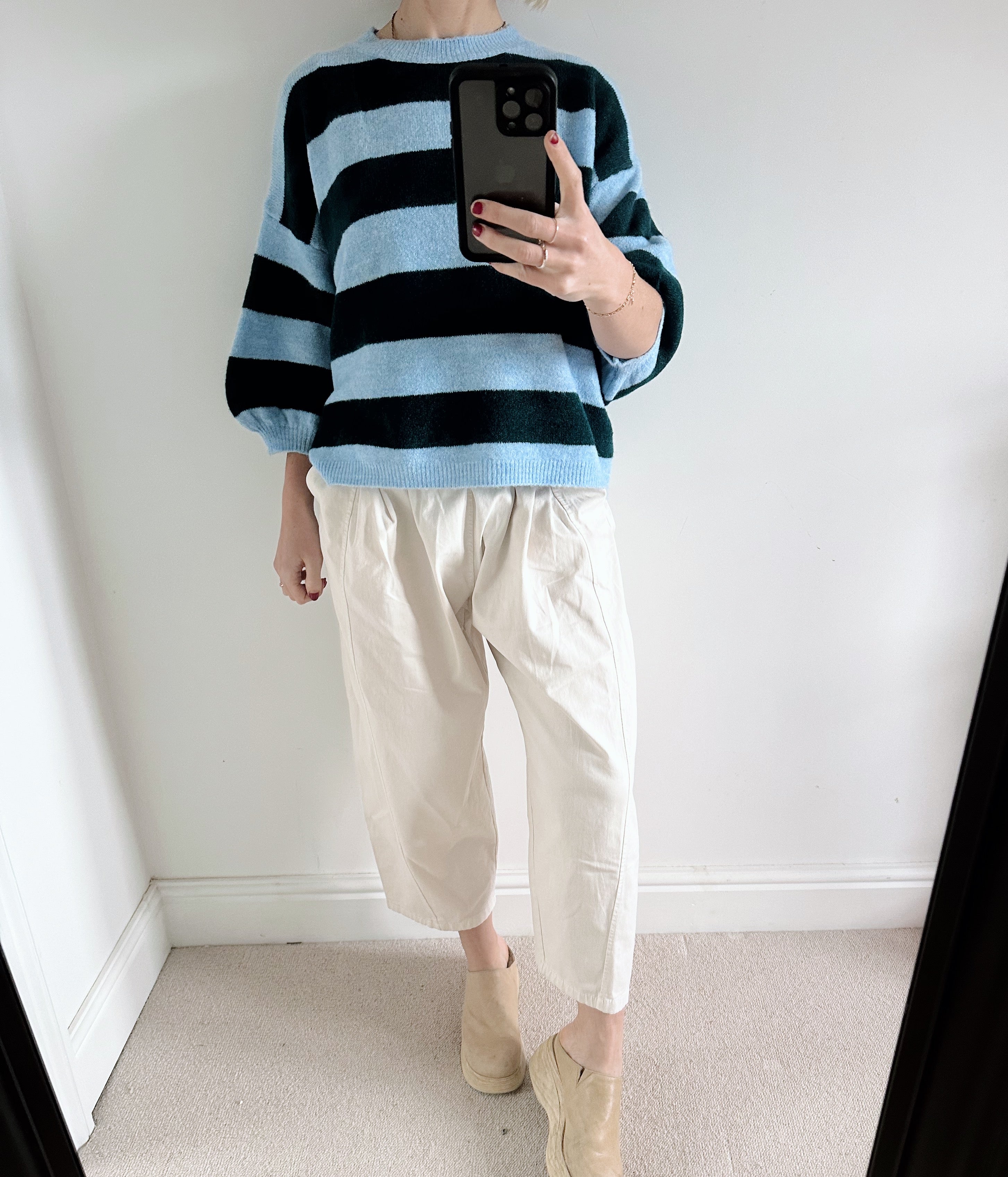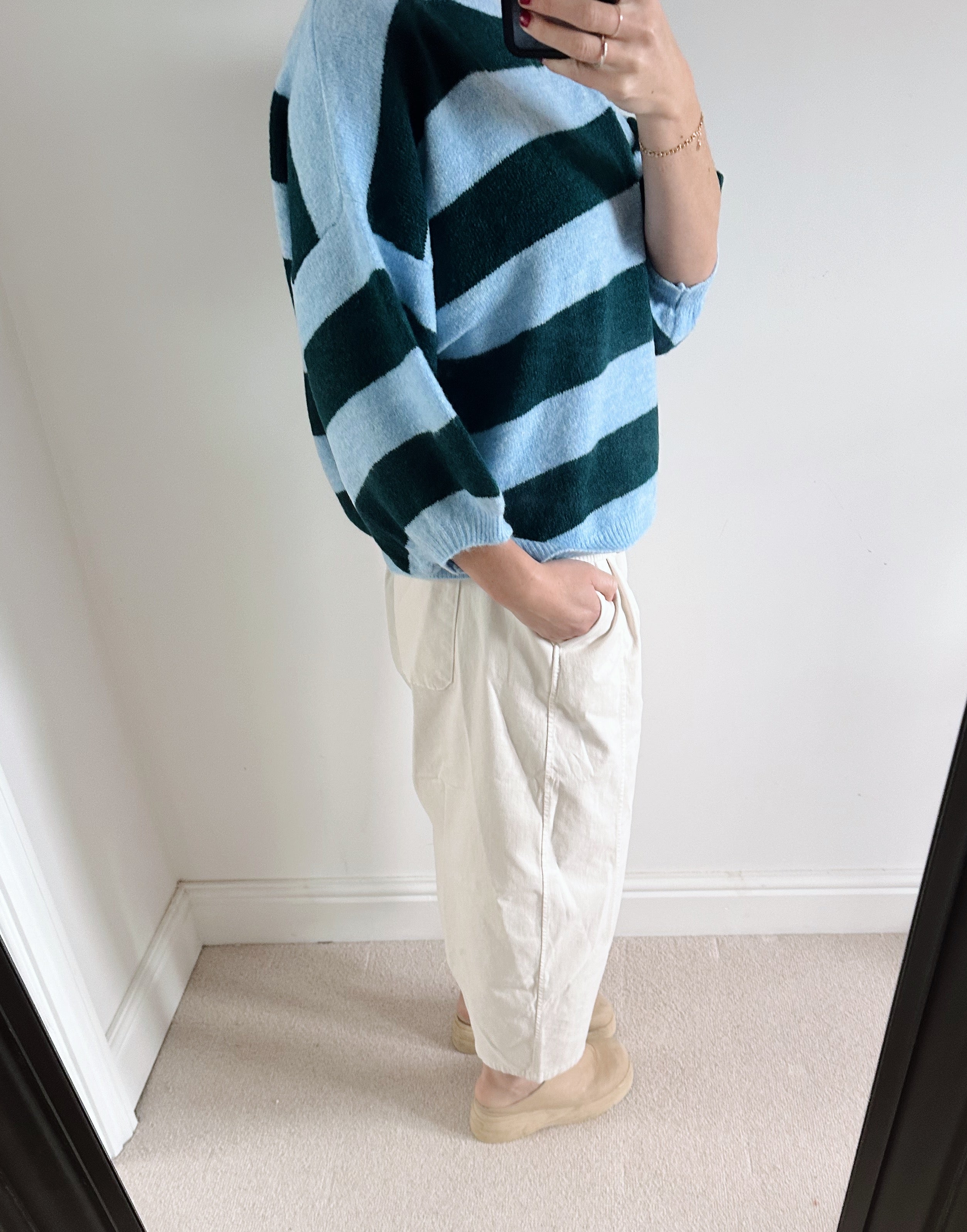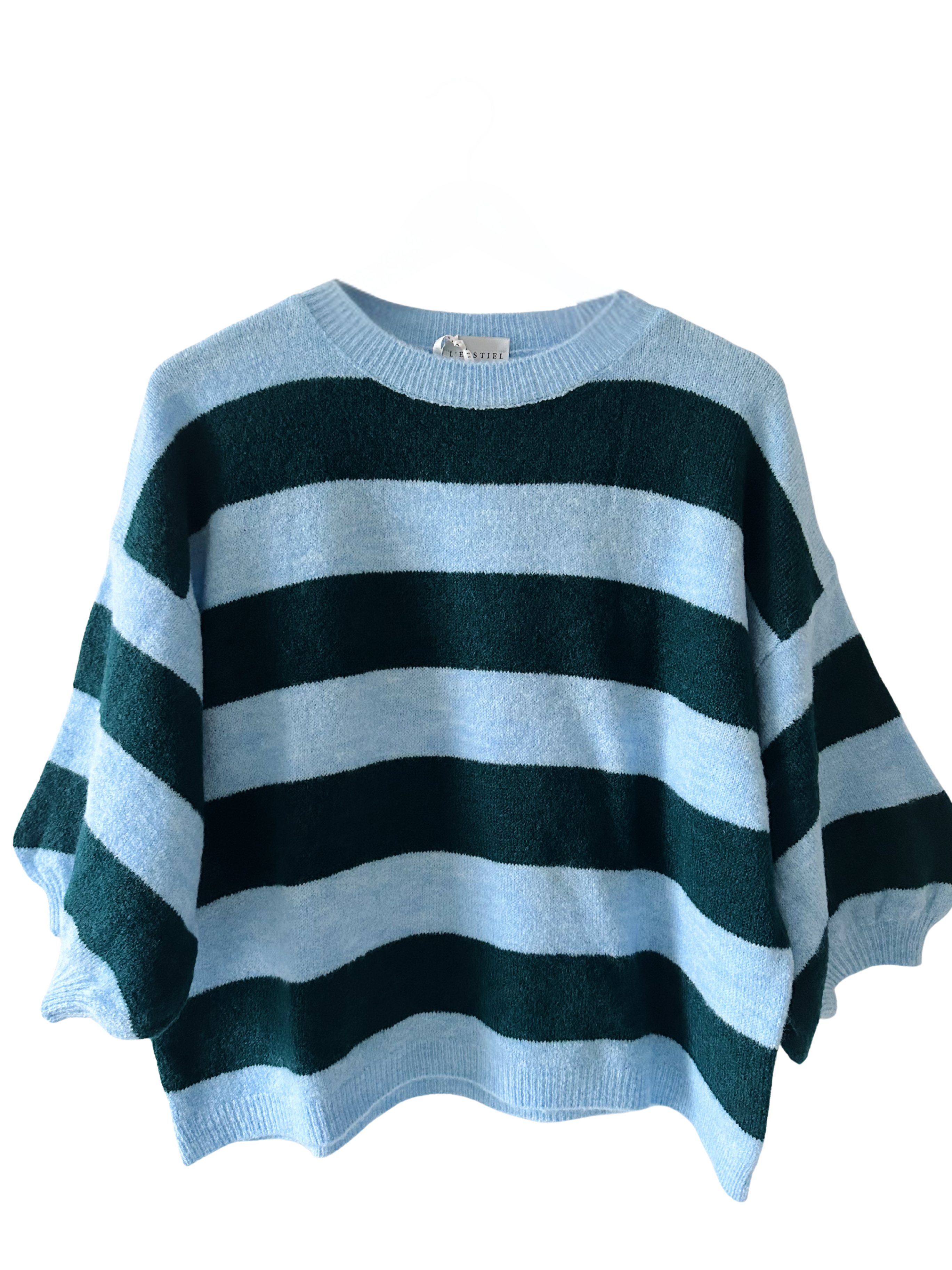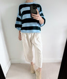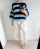 The blue and sky blue stripes bring a clean, uplifting feel — perfect for brightening your wardrobe through the cooler months and beyond. Easy to style and comfortable to wear, it’s the kind of knit you’ll keep coming back to.