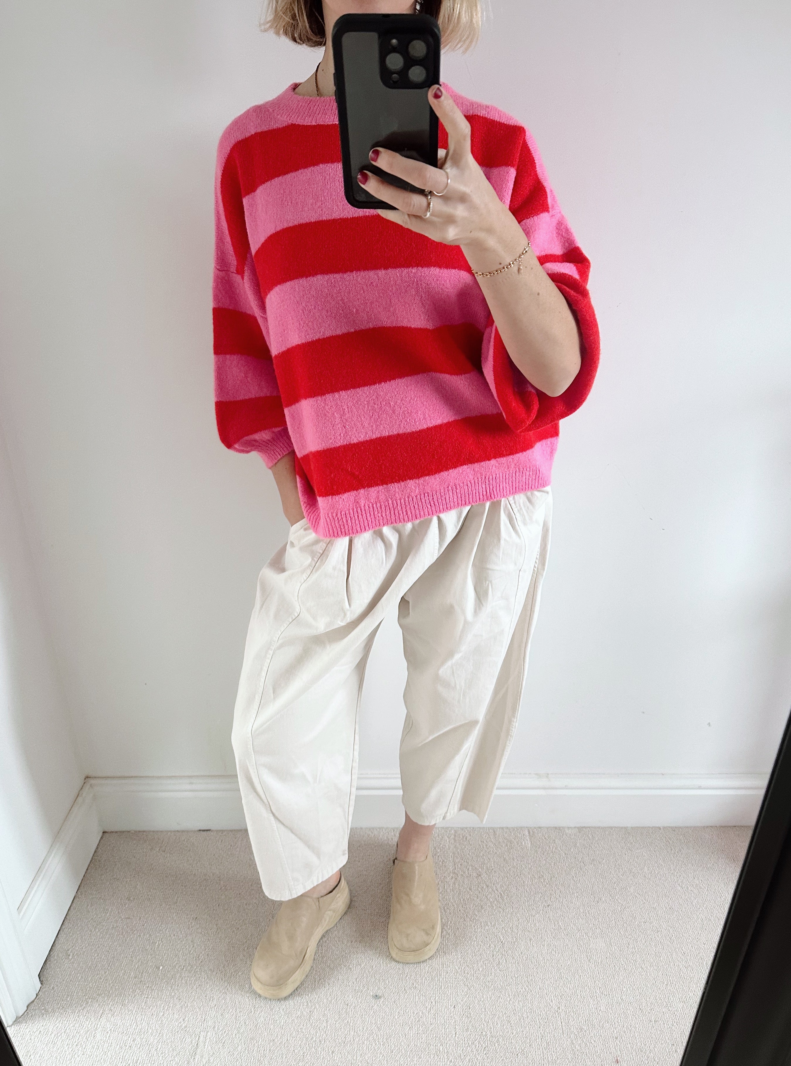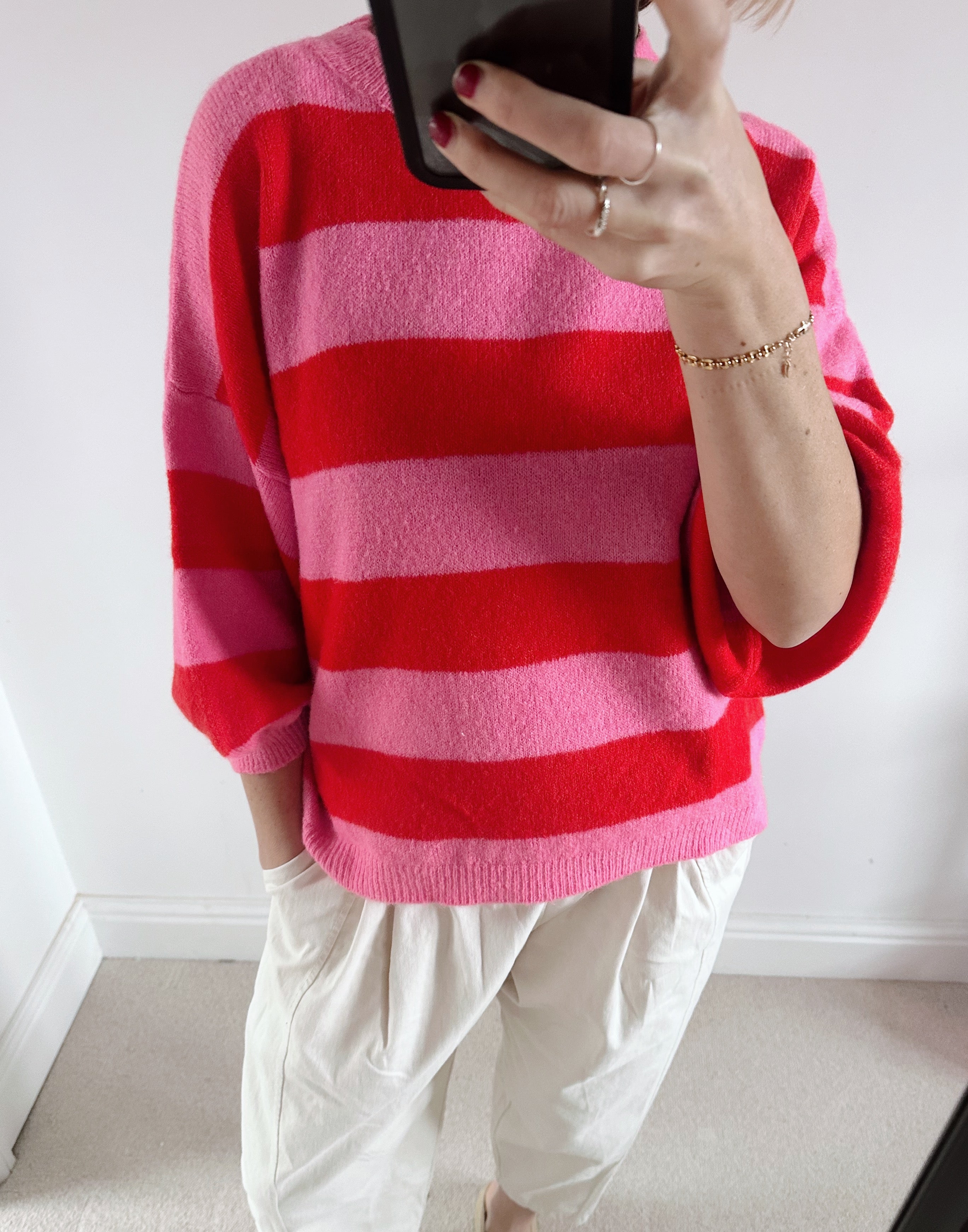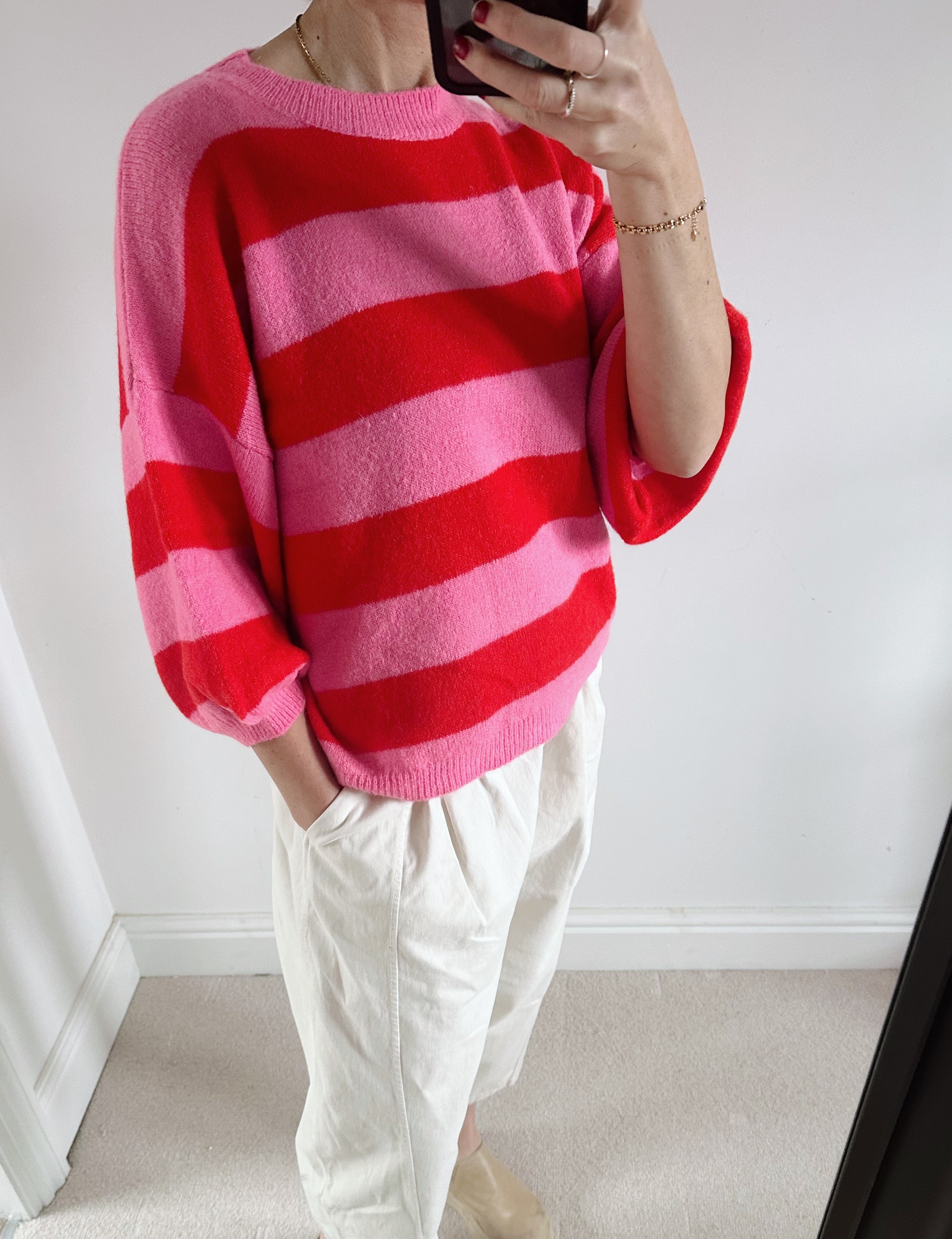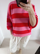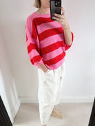 Add a joyful pop of colour to your knitwear collection with this vibrant red and pink striped jumper. Designed to lift even the greyest of days, it features bold stripes that feel playful yet effortlessly wearable.