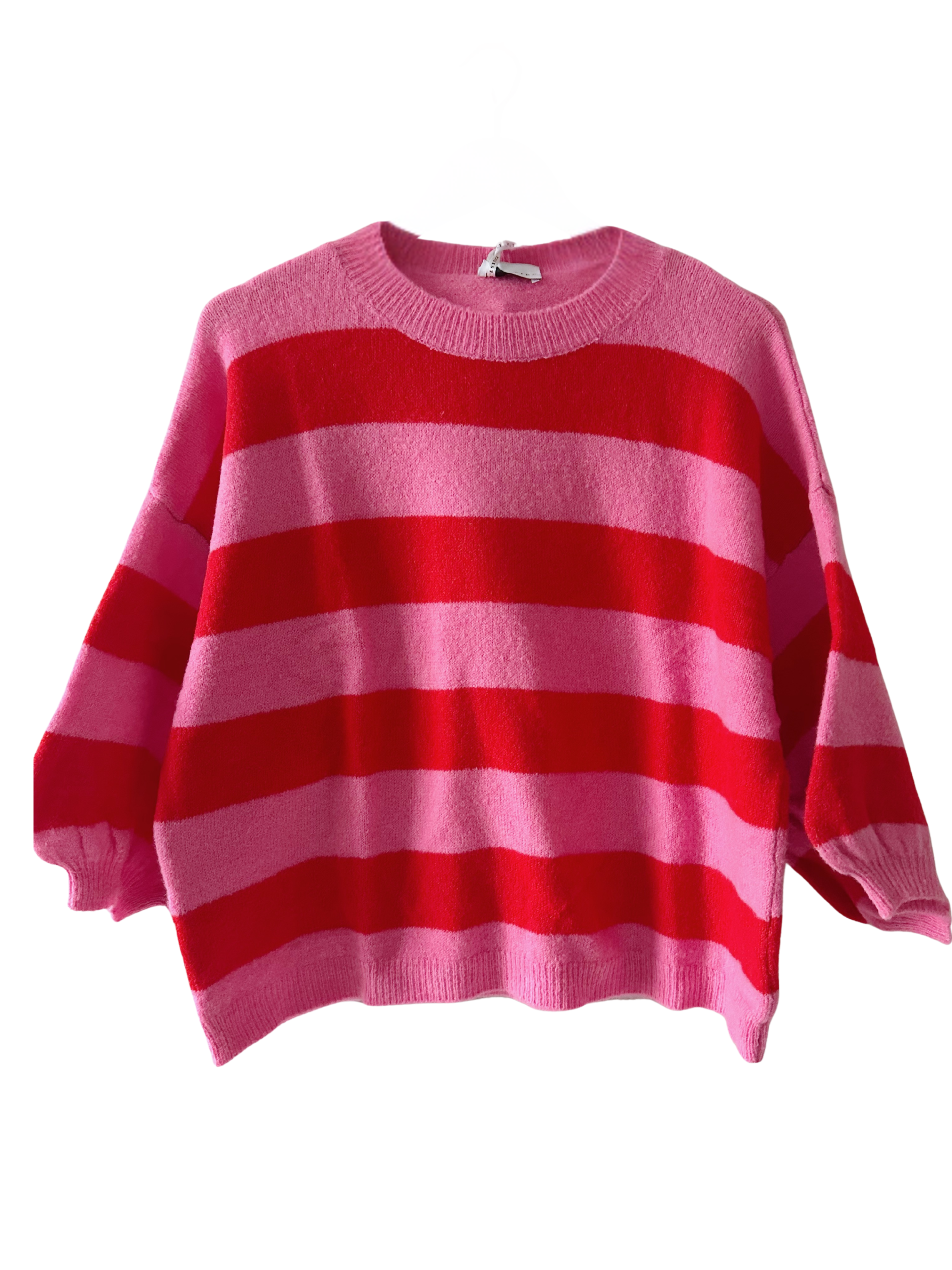 Red and Pink Striped Knit Sweater with Balloon Sleeves