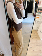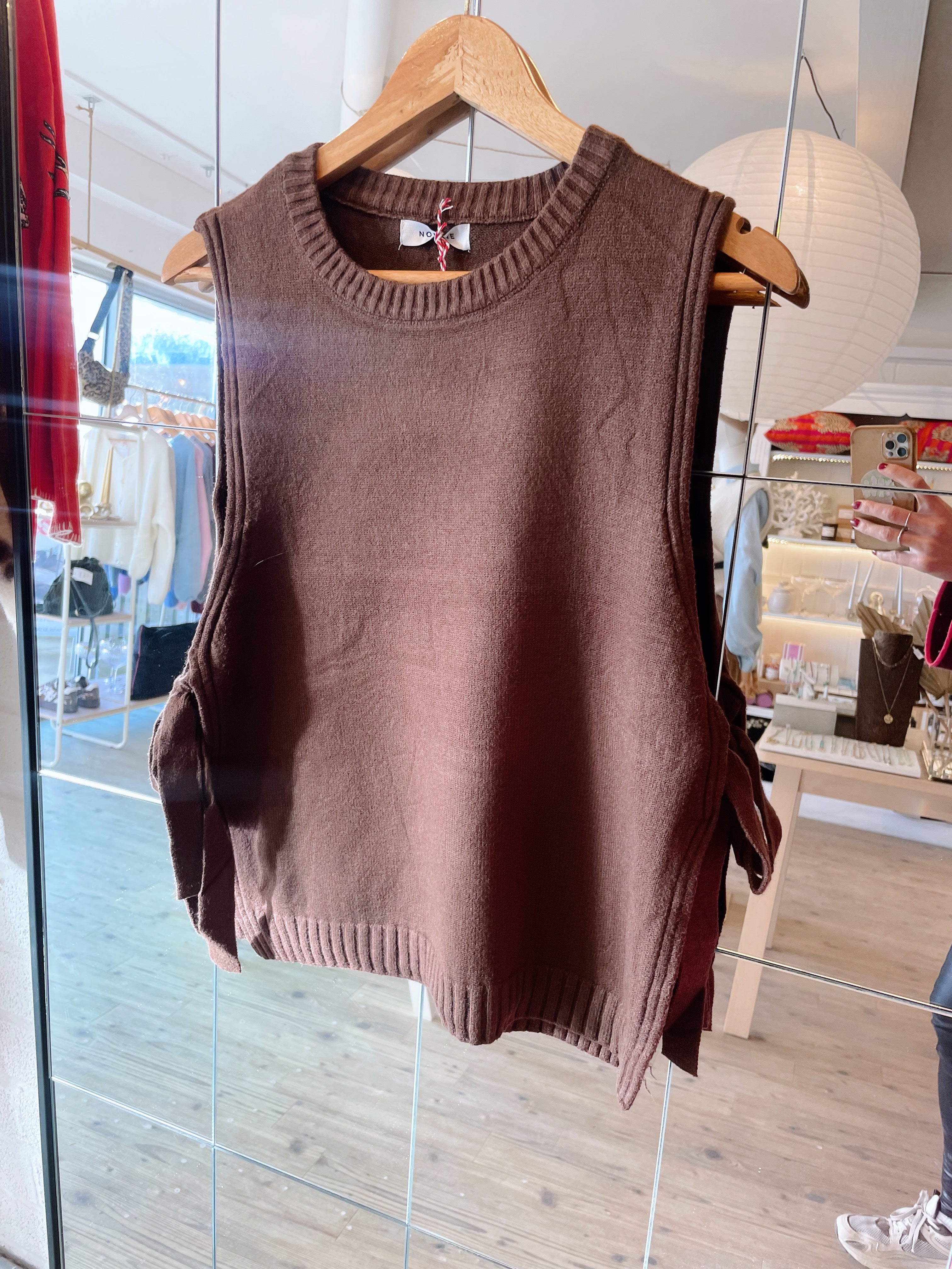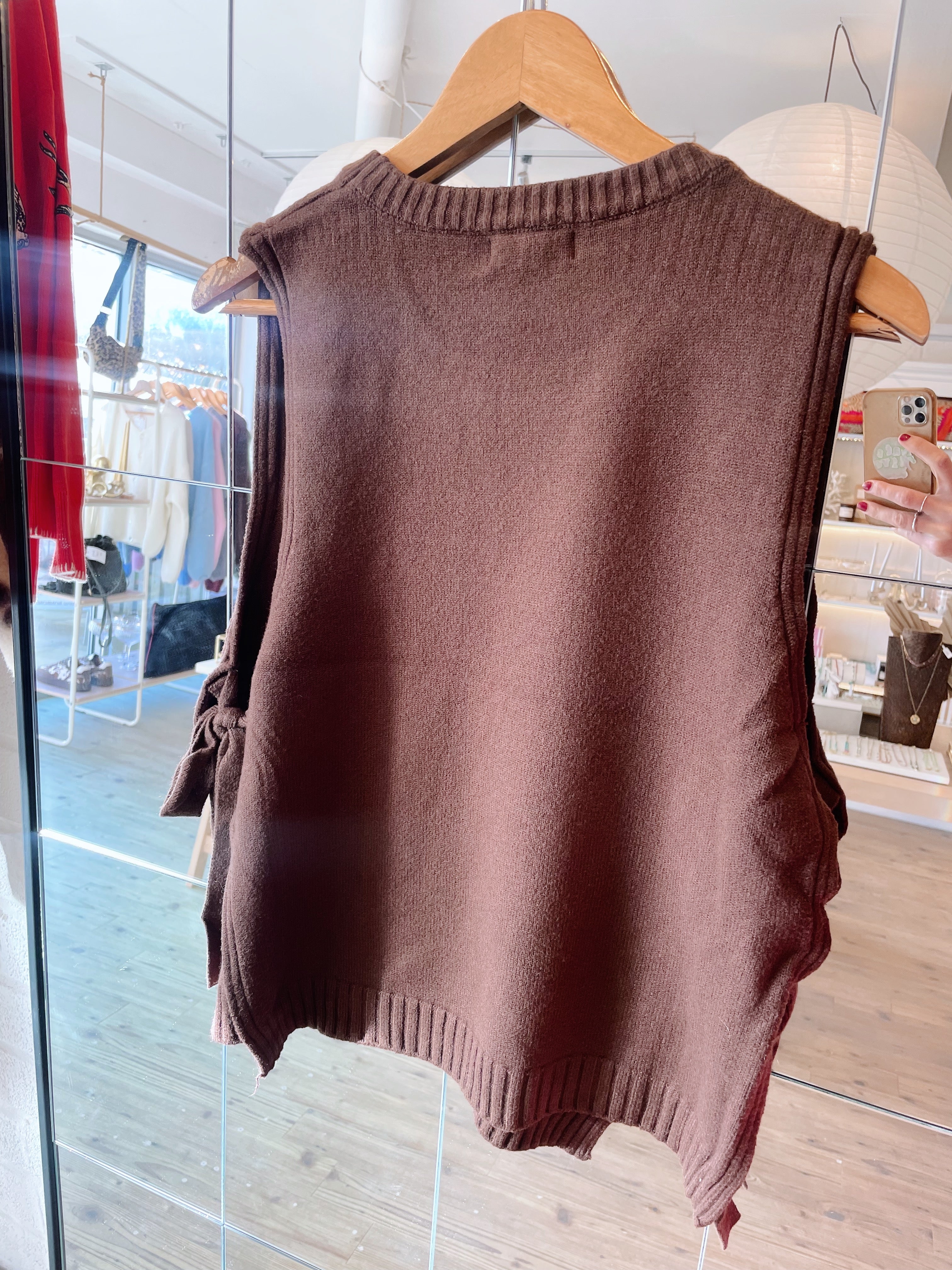 Elevate your layering game with the Bown Knitted Vest Top. Crafted in a rich chocolate brown, this versatile piece features tie-up sides for a customizable fit, making it perfect for styling over shirts or dresses. Designed with a classic round neck and sleeveless cut, it offers effortless comfort and a modern, chic look. Made from a soft, breathable knit blend of 50% viscose, 30% polyamide, and 20% polyester, it drapes beautifully and feels luxurious against the skin. One size fits UK 8–12, making it an easy and stylish addition to any wardrobe.