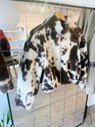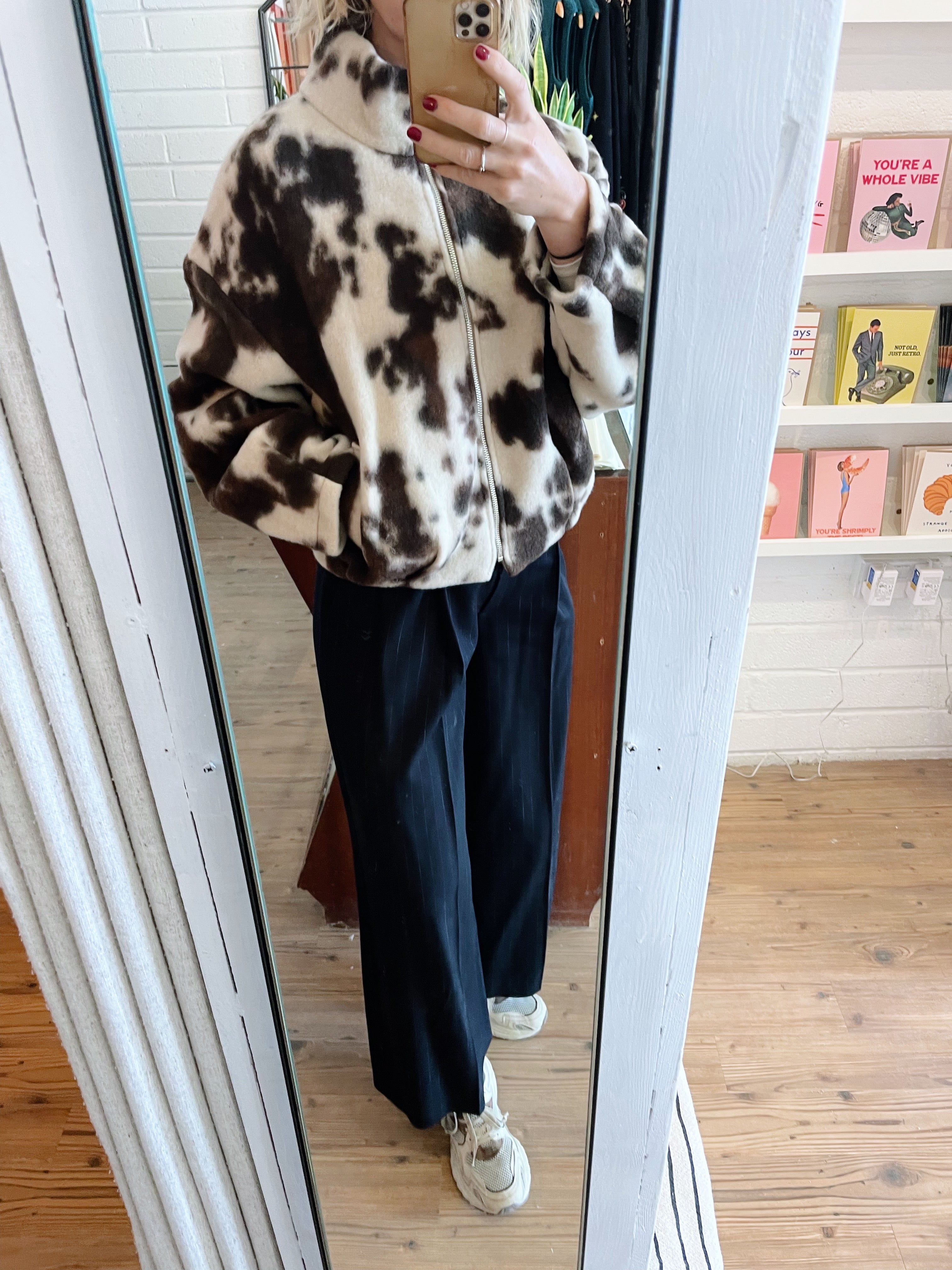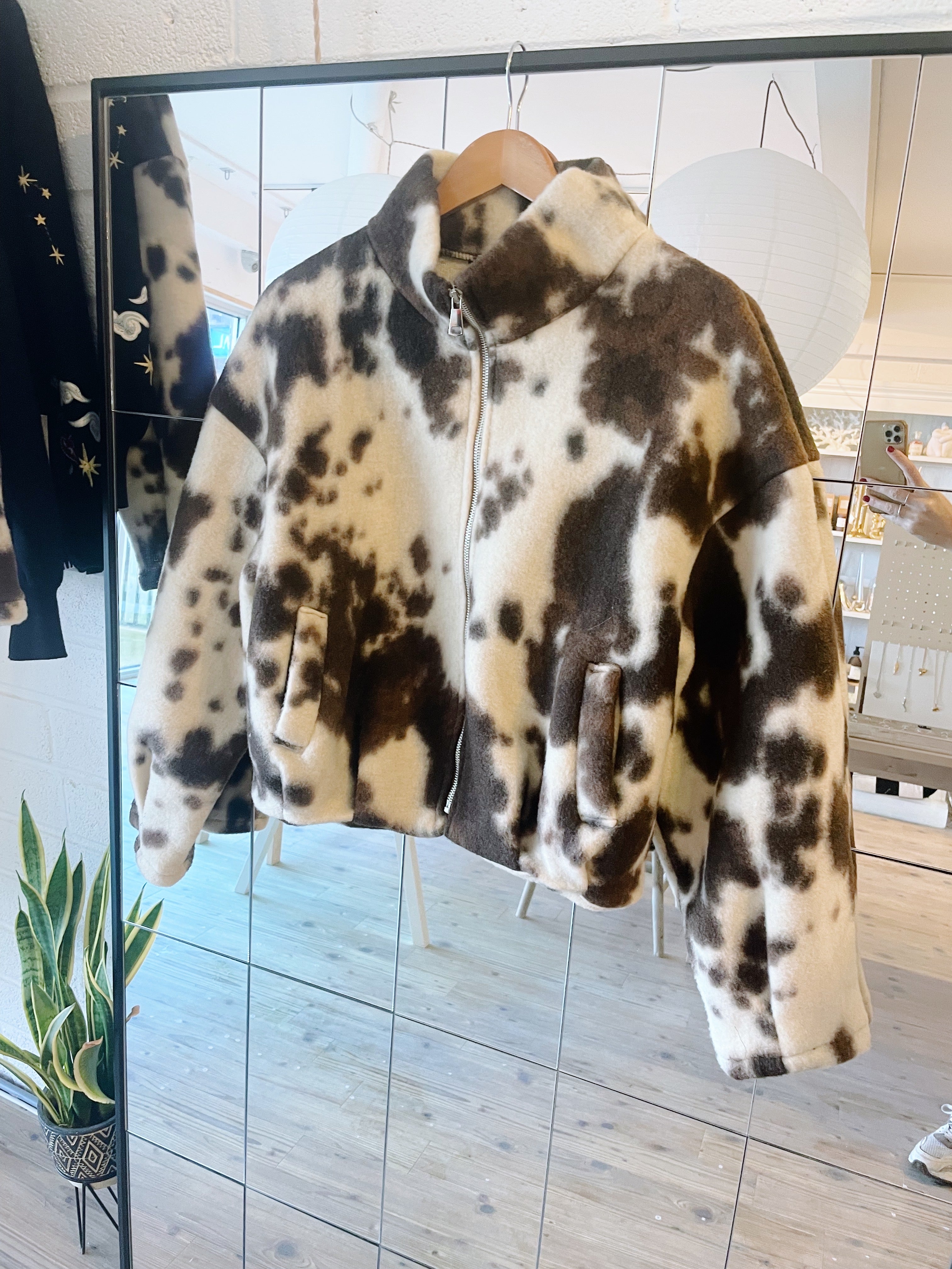 Stay warm and stylish with this cow print fleece jacket, made in Italy. Designed in a bomber style with a high neck and front zip fastening, it combines comfort with a contemporary look. The soft fleece fabric features a bold cow print pattern, perfect for adding character to your casual outfits.