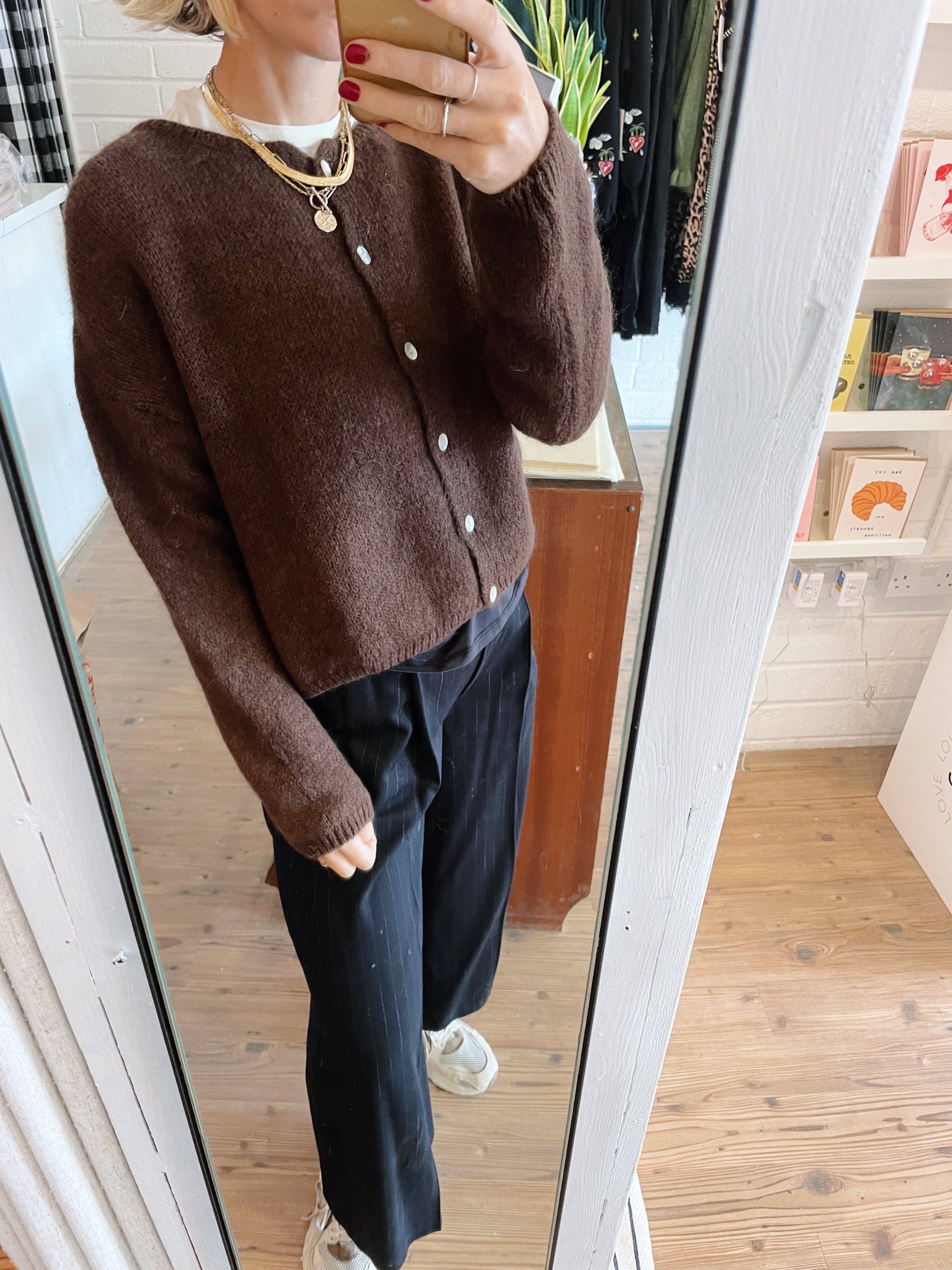 Elevate your wardrobe with this luxurious kid mohair and wool cardigan crafted in Italy for exceptional quality. Featuring a classic round neck and chic short sleeves, it blends timeless elegance with a modern, airy silhouette. The brown is a deep warm colour for autumn