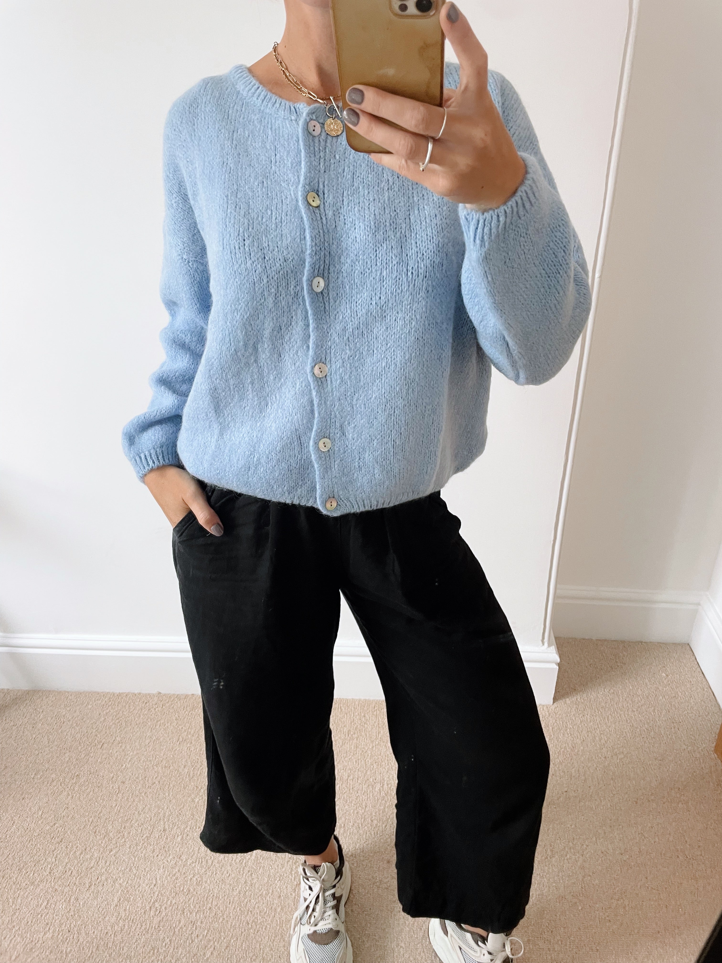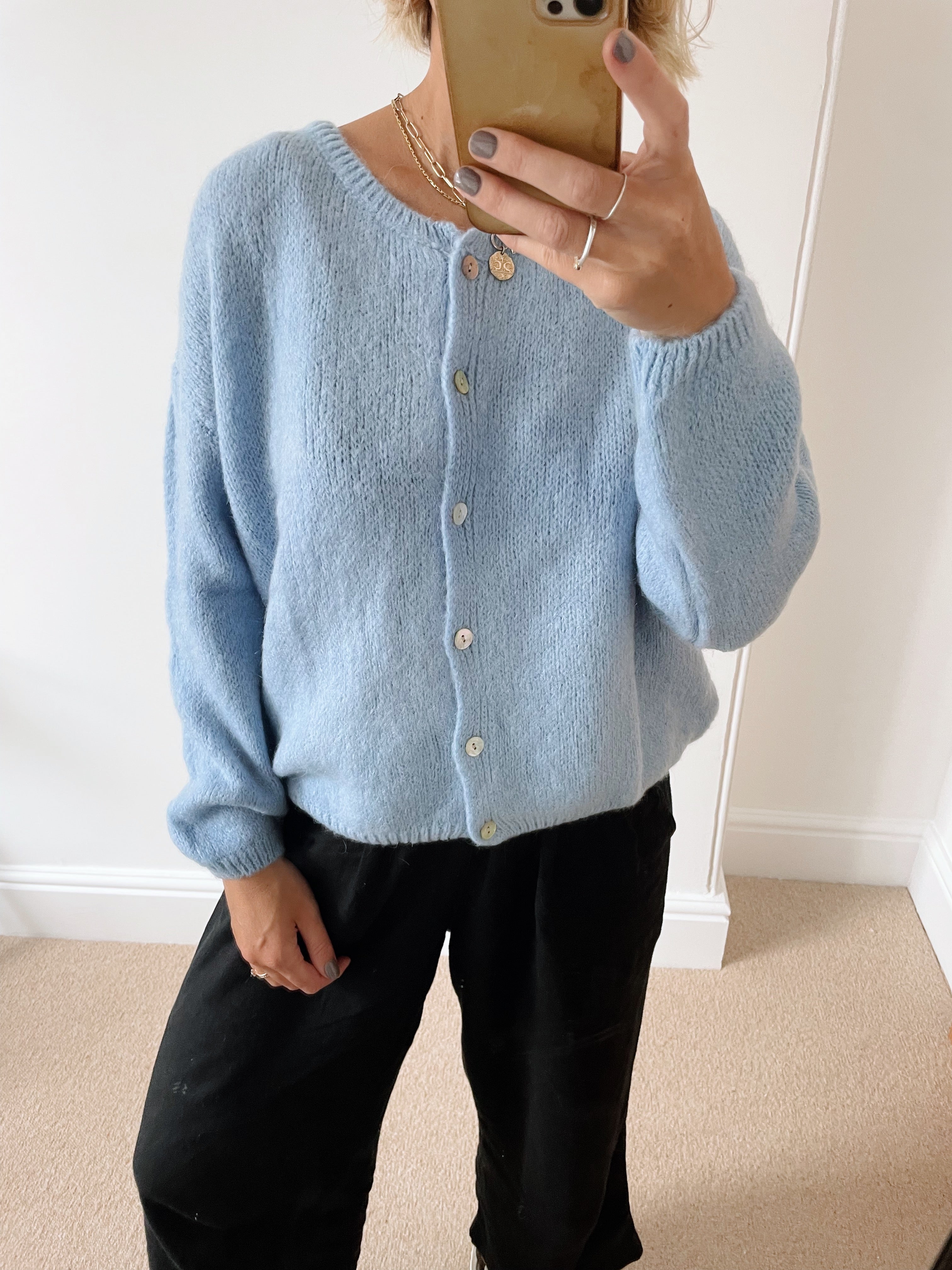 Elevate your wardrobe with this luxurious kid mohair and wool cardigan crafted in Italy for exceptional quality. Featuring a classic round neck and chic short sleeves, it blends timeless elegance with a modern, airy silhouette. The delicate sky blue hue adds colour , perfect for brightening any outfit.