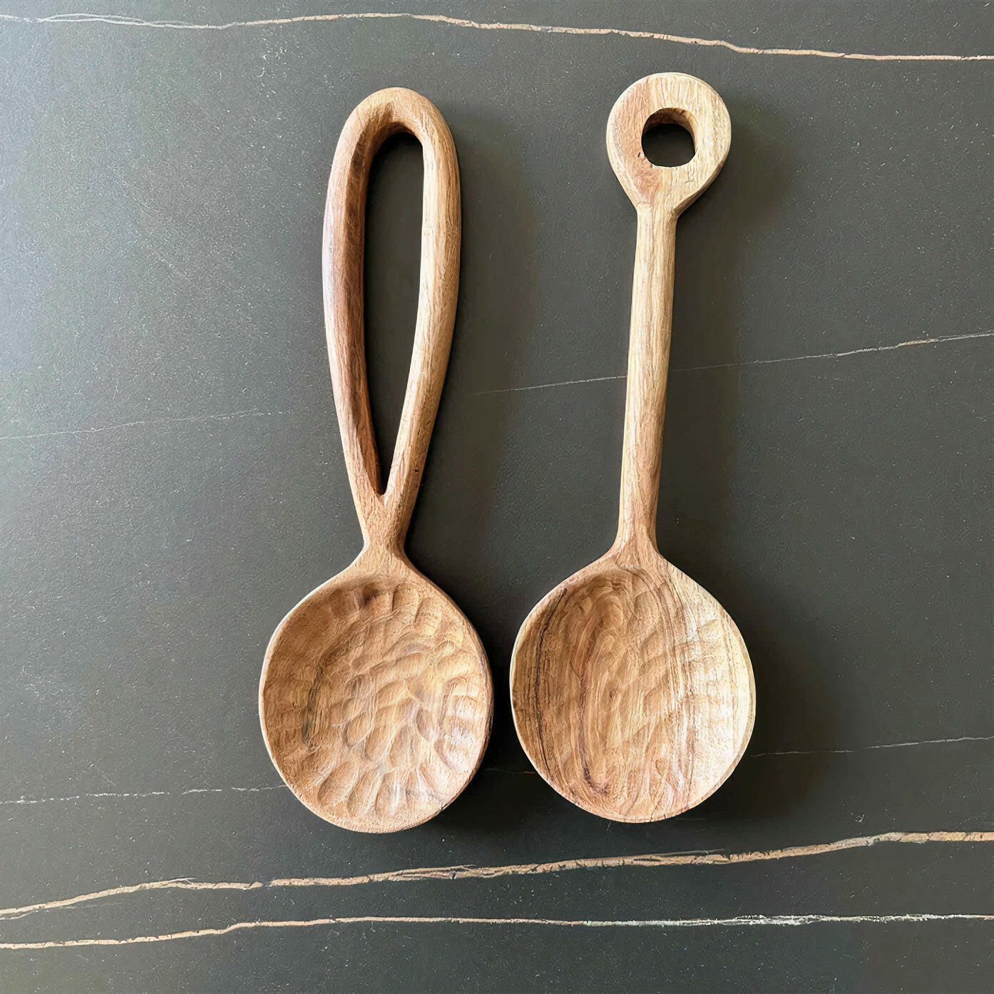 Crafted with a bohemian influence, these wooden salad servers embody the ideals of slow living. Featuring a looped handle with an organic shape, they bring a sense of natural beauty to any meal.