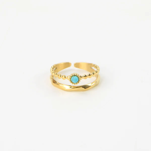 With an open ring design, this stainless steel ring fits all sizes and features a beautiful turquoise stone that is both waterproof and tarnish-free. Two rings in one, for a unique and versatile accessory. A perfect gift for her!