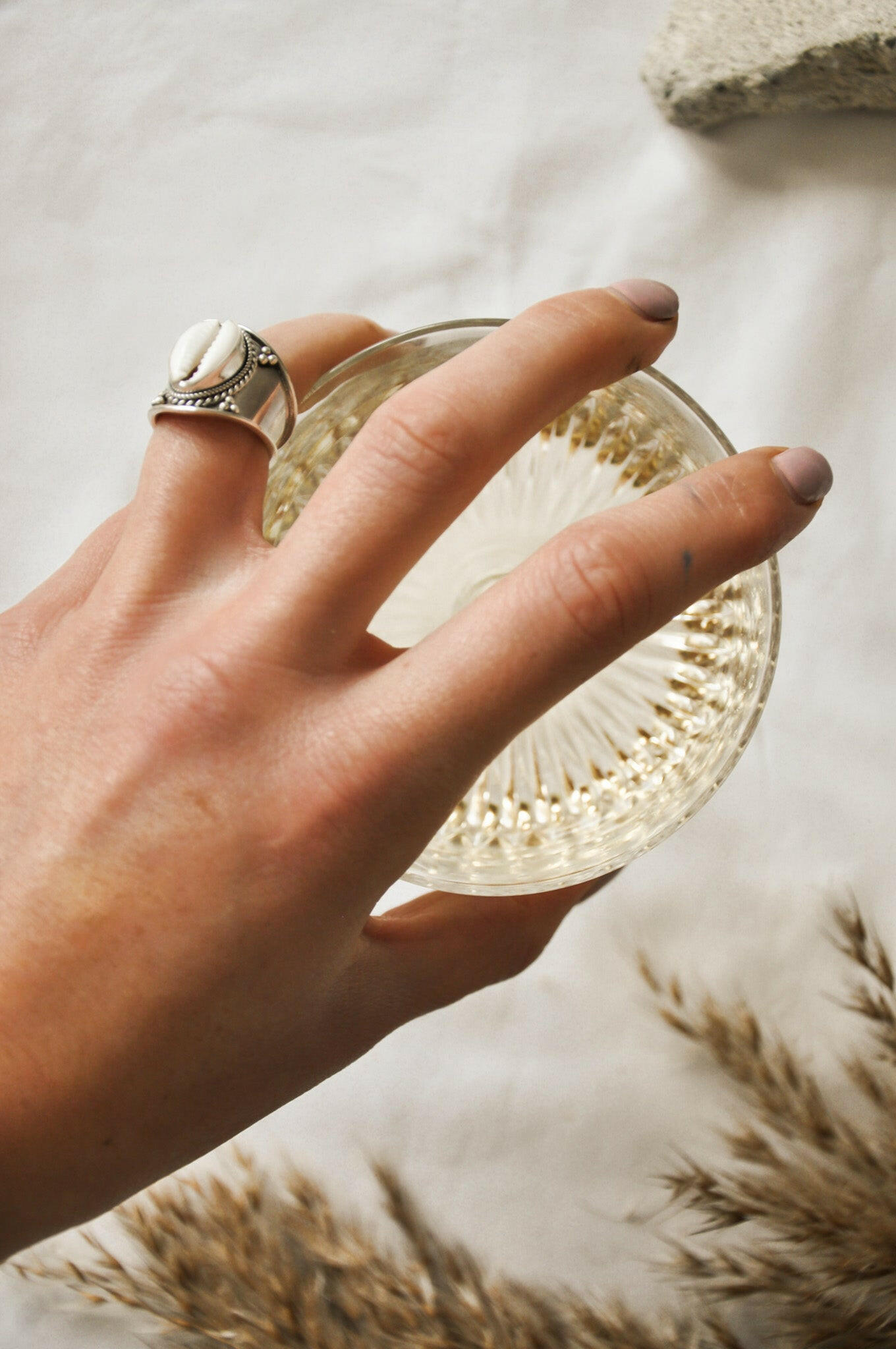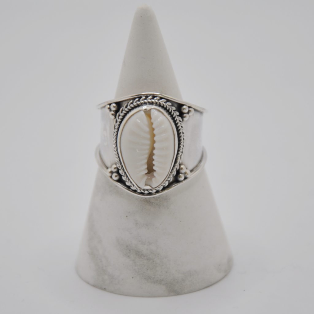 Handmade cowrie shield ring in sterling silver with intricate rope detailing at the front. Beautiful ring with a true bohemian look. This statement ring is perfect for finishing off any boho look.