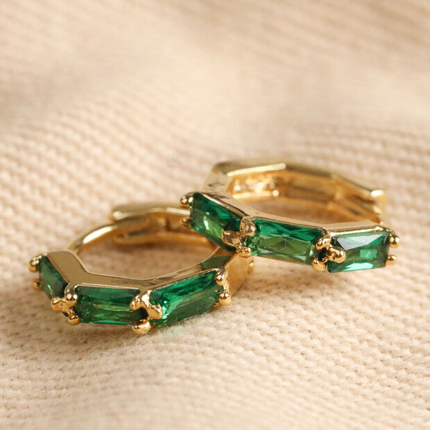 Green Baguette Crystal Huggie Hoop Earrings in Gold