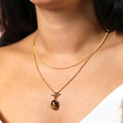 A double-layered gold chain necklace featuring an oval tiger’s eye pendant, paired with a stylish faux T-bar toggle charm. A versatile piece, perfect for both modern and formal jewellery collections.