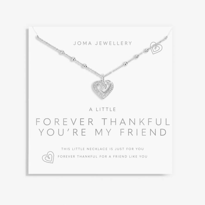 Unleash the power of friendship with our A Little 'Forever Thankful You Are My Friend' necklace in silver plating. This adorable necklace is a perfect way to celebrate life's precious moments and show appreciation to that special friend in your life. The silver-plated chain is adorned with a charming linked heart pendant, symbolizing the everlasting bond of friendship. Each necklace comes with a sentiment-stamped card, making it a sweet and thoughtful addition to any jewelry collection.