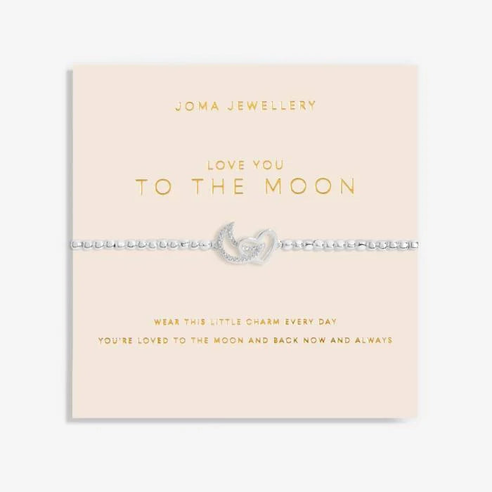 This beautiful bracelet features a silver-plated design with a moon and heart-shaped charm and sparkling pavé crystals. Complete with a pretty blush pink card which has been stamped with the sentiment ‘Love You To The Moon’ and a sweet poem. Perfect for celebrating every special occasion.