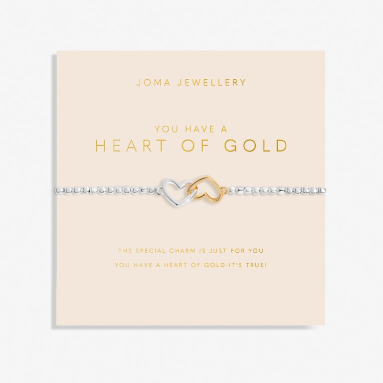 This beautiful bracelet features a gold and silver-plated design with a sparkling heart-shaped charm. Complete with a pretty blush pink card which has been stamped with the sentiment 'You Have A Heart Of Gold' and a sweet poem. Perfect for celebrating every special occasion.