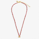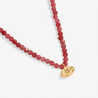 The Mini Charms Garnet eye necklace in gold plating features a classic clasp chain threaded with enchanting cherry red real semi-precious Garnet gemstones and a small shimmering eye charm.