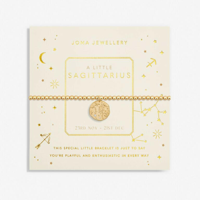 Get ready to make your loved one's wrist stack shimmer this season with our gorgeous new-look Star Sign A Little Bracelets. Threaded with gold-plated beads, crowned with a gold-plated disc, dotted with the Sagittarius Star Sign in Cubic Zirconia crystals.