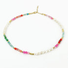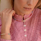 We love this short dopamine necklace, perfect for layering colour into your necklace stack. Featuring a vibrant mix of semi-precious stones and freshwater pearls, it adds a playful yet elevated touch to any look.