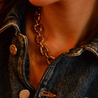 Make a bold style statement with this on-trend chunky gold necklace. Designed with eye-catching oval-shaped links, this piece adds a modern yet timeless edge to any outfit. The classic T-bar fastening not only ensures a secure fit but also enhances its stylish appeal.