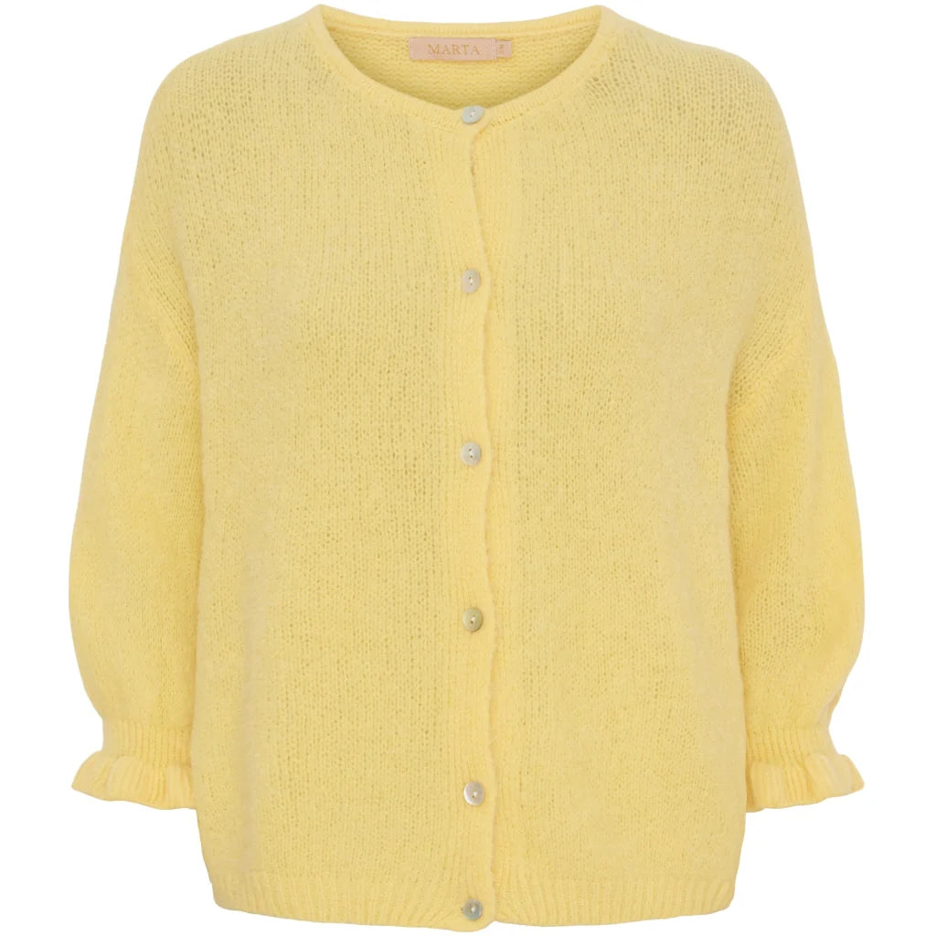 Add a touch of charm to your wardrobe with this beautifully yellow knitted cardigan from Marta. Designed with delicate ruffle details at the cuffs and classic front buttons, it's a versatile piece that's perfect for layering. Whether styled with jeans, tailored trousers or a skirt, this cardigan works effortlessly for everyday wear.