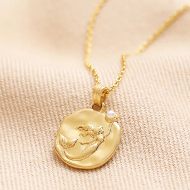 Suspended by a delicate trace chain, this organic-shaped pendant features a mermaid design holding a cream pearl. Fastening with a lobster clasp and two extender links, this is the perfect pick for layering.