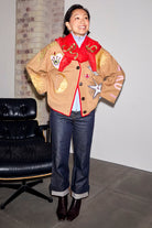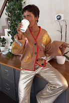 Its back! The bestselling Never Fully Dressed Camel Mystical Cardigan. A light throw-over for when the evenings turn chilly, finished with thicker ribbed hems that create a subtle bomber-inspired silhouette. The knitted fabric is beautifully soft to the touch with a satisfying weight that drapes the frame effortlessly. Delicate embroidered motifs take inspiration from the accents of gold and silver, alongside the engraved suns and moons found throughout the souks of Marrakech.