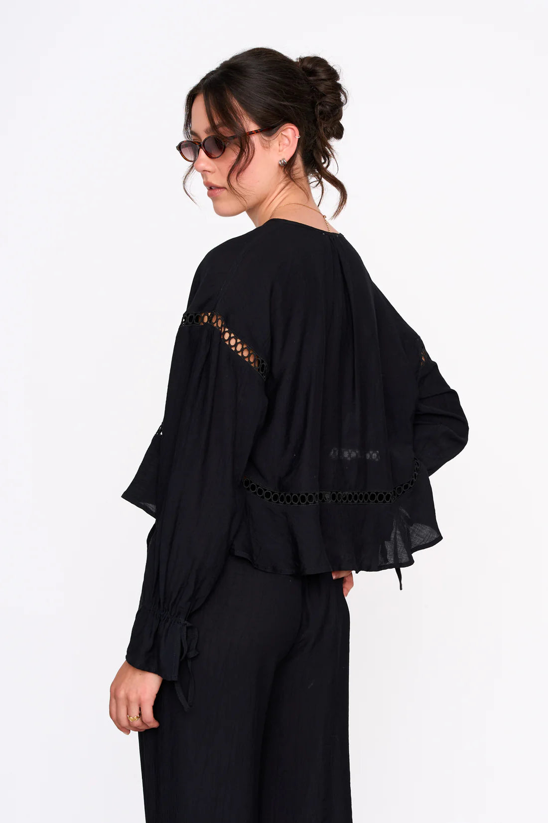 From 24 colours comes this beautiful black long-sleeved blouse featuring delicate crochet inserts and a tie neckline. Perfect for dressing up or down, it can be styled with matching trousers for a chic co-ord look or paired with jeans for effortless everyday style. The fluttering volants add a touch of bohemian elegance, making it a versatile wardrobe staple.
