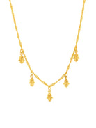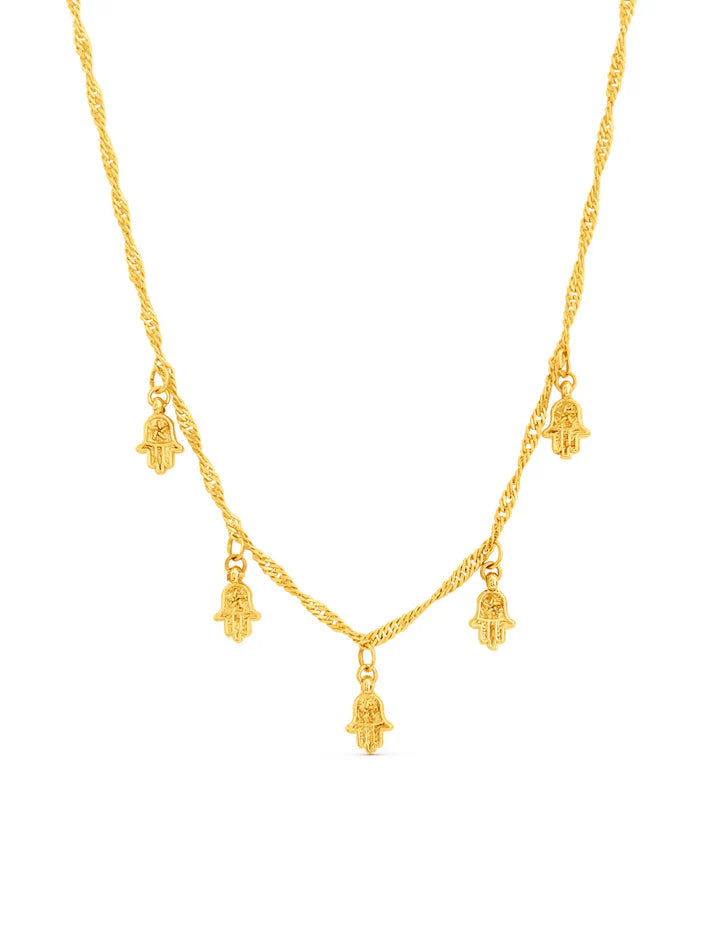 Surrender to the ancient allure of the Inda choker necklace. Five mini hamsa hand charms suspended on a delicate gold chain make this talisman choker the perfect choice to bring a free spirited vibe to your everyday. Wear it solo or layer it up.