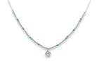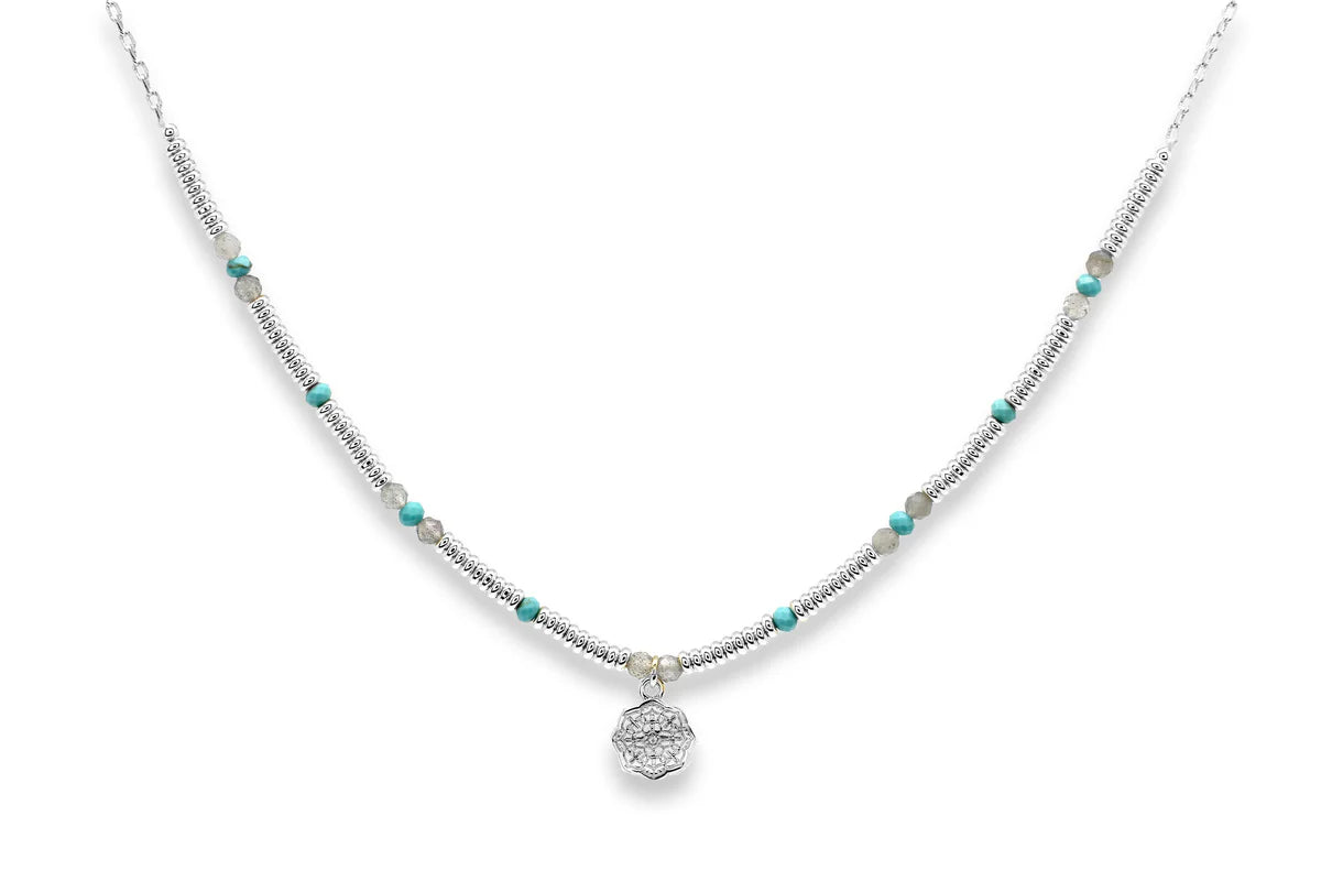 A classic mid-length silver necklace with silver beads, turquoise and labradorite gemstones on a silver chain. This go-to necklace also features one of our signature silver charms.