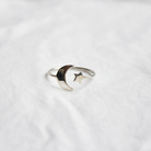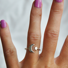 This intricately crafted silver ring features a delicate moon and stars design. While we offer a variety of sizes, its unique design allows for adjustability.