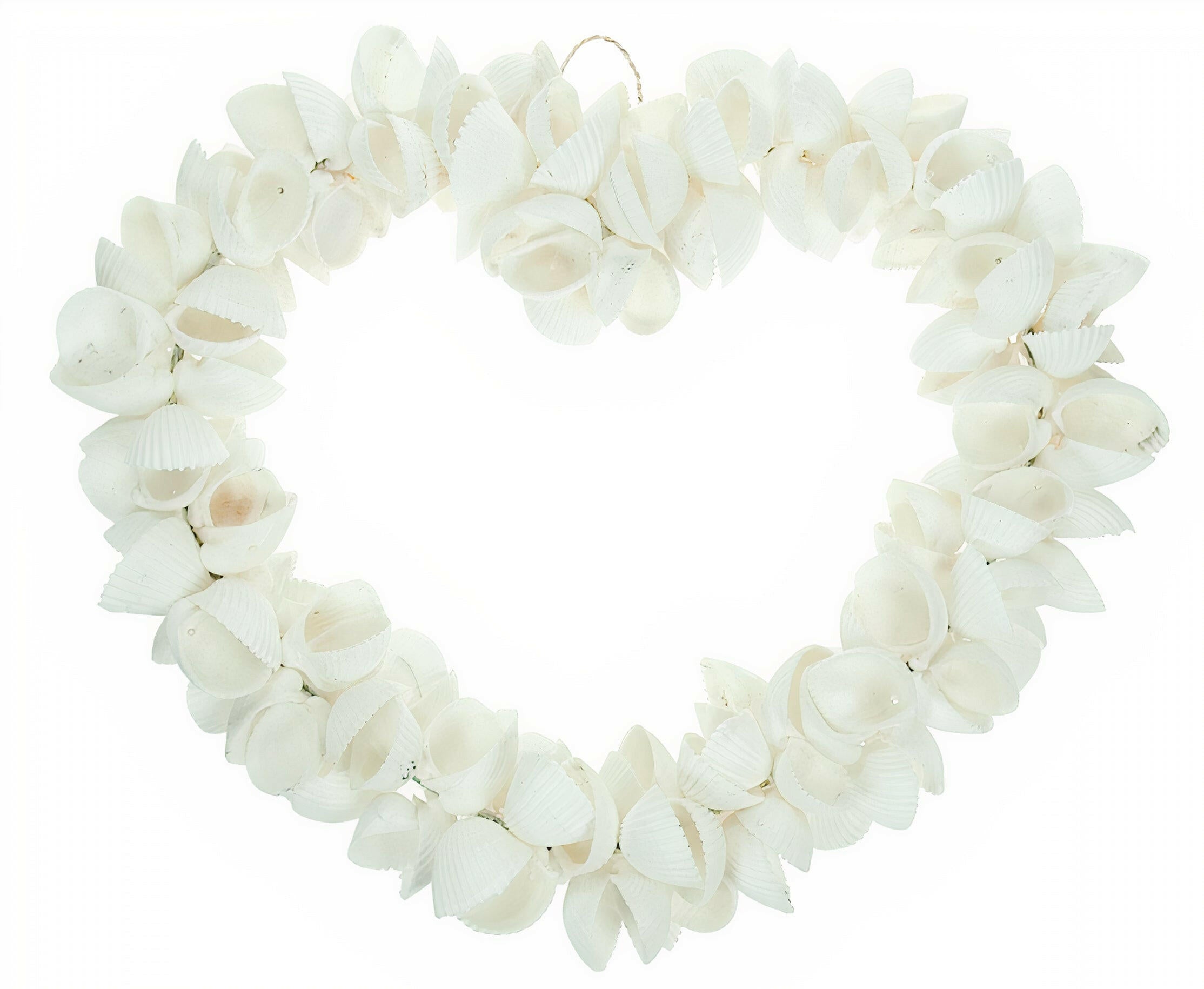 White shell boho wreath in the shape of a heart. Perfect for hanging on your door or wall. Lovely memento of beautiful beach days.