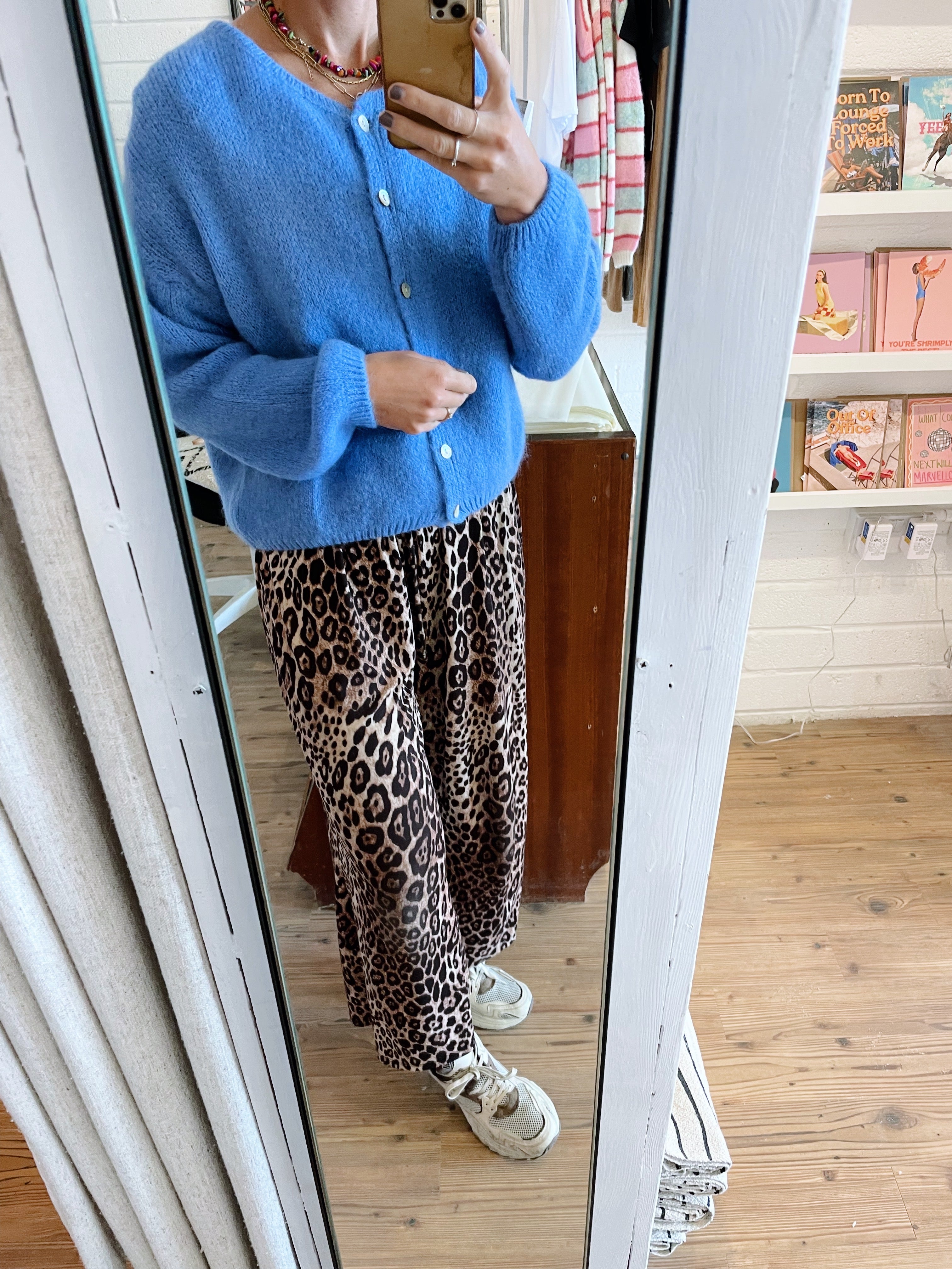 Elevate your wardrobe with this luxurious kid mohair and wool cardigan crafted in Italy for exceptional quality. Featuring a classic round neck and chic short sleeves, it blends timeless elegance with a modern, airy silhouette. The blue is a pop of colour for autumn