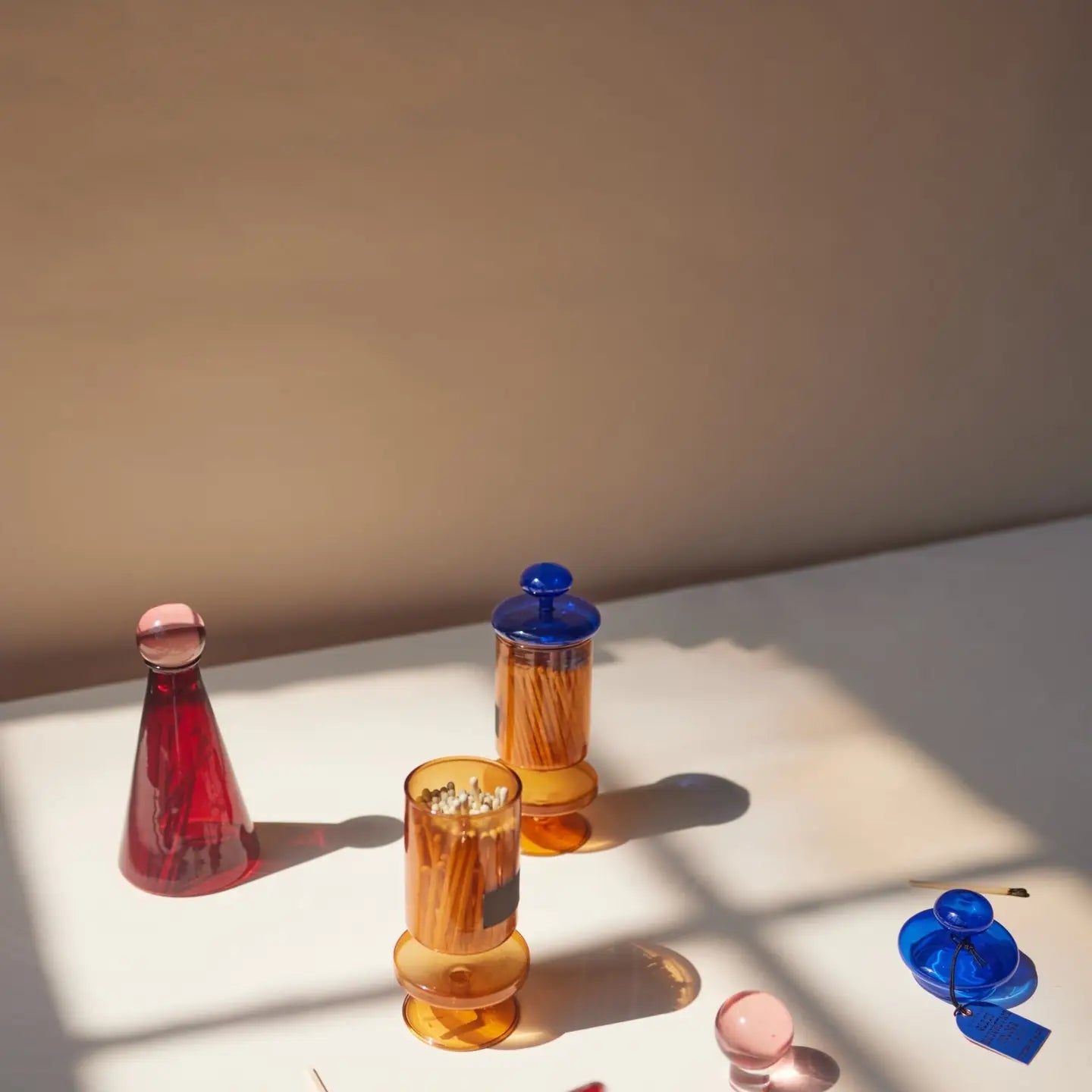 Bring style and function to your shelves and small spaces with our Glass Jar of Matches. These luxurious glass jars feature a vibrant tinted design and distinctive shapes, making them a striking statement piece for any home. Each jar comes complete with safety matches, a built-in match striker on the back, and a colour-coordinated hang tag for a thoughtful finishing touch.