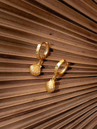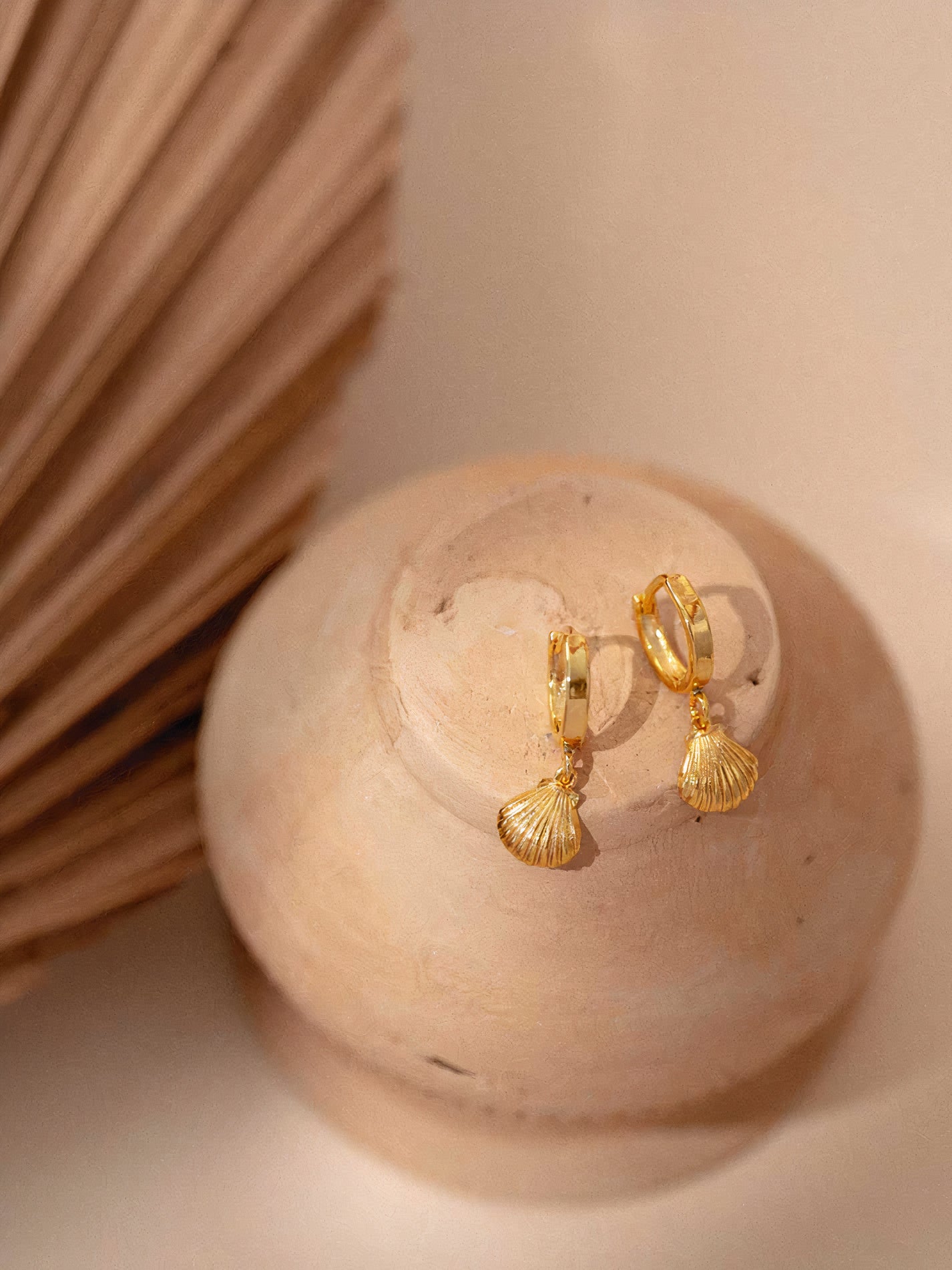 Featuring intricately carved mini scallop shell pendants dangling from our classic gold huggie earrings, these versatile pieces are a must-have for your summer collection. Wear them solo for a carefree look, or pair them with our larger statement hoops for a bold statement. Additional information: Hoop diameter: 11mm, Pendant size: 9mm.