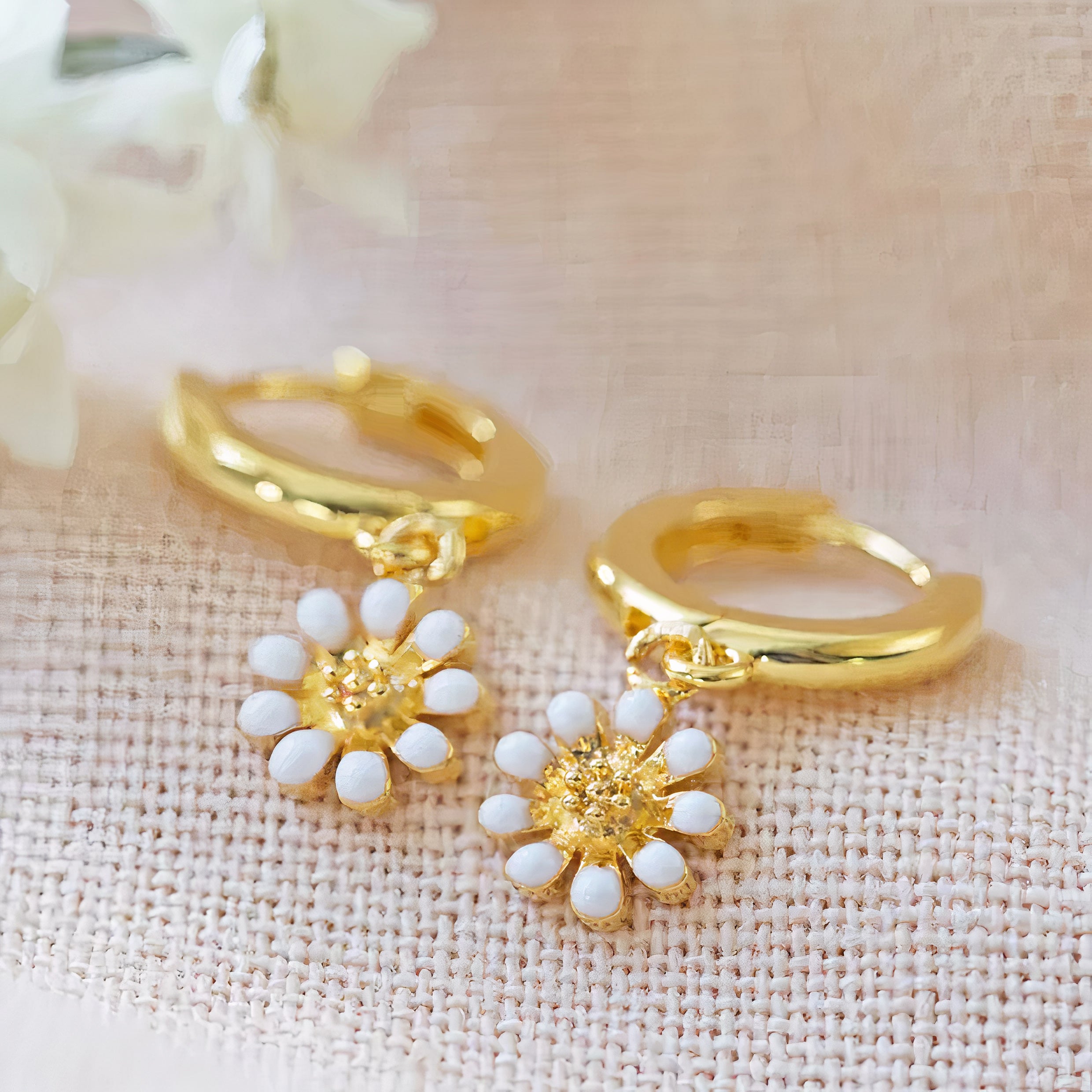 Gold Daisy White Enamel Huggies