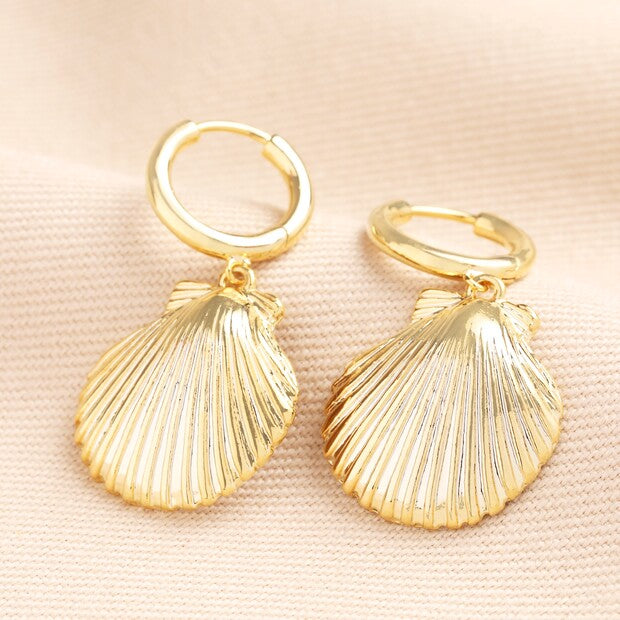 Large Shell Charm Huggie Hoop Earrings in Gold