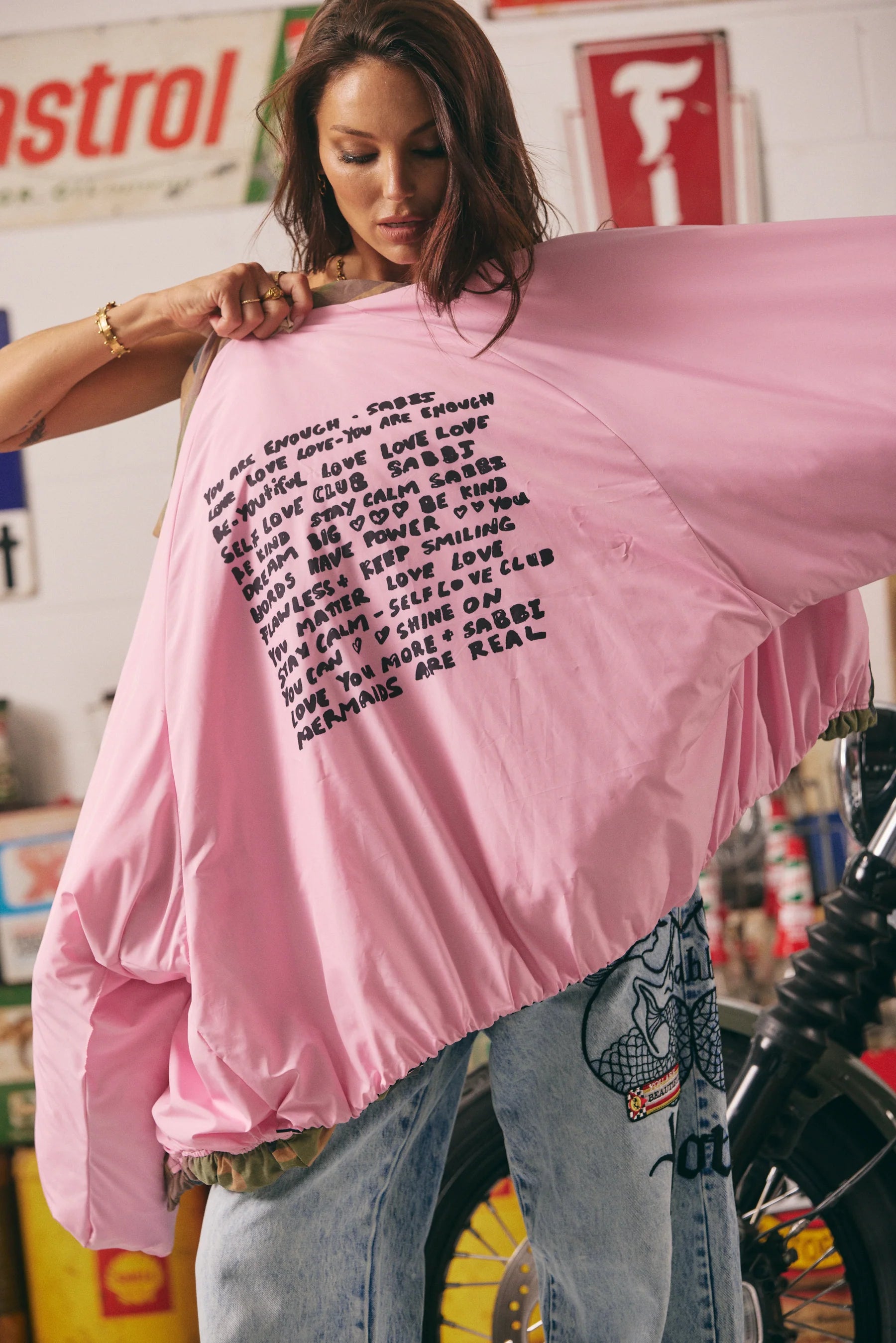 Unzip it and things get even better. Inside you’ll find a bubblegum pink lining covered in feel-good affirmations from the Sabbi Love Club — your own private pep talk, stitched right in.