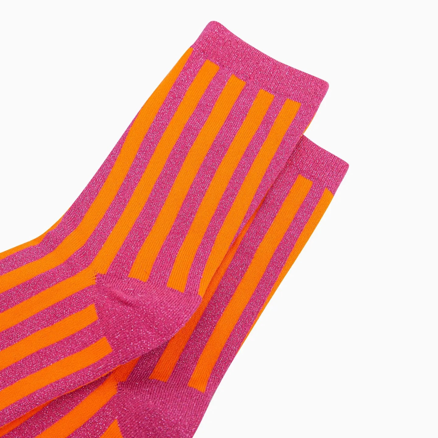 Add a pop of colour to your outfit with these vertical stripe cotton glitter socks in orange and pink. The soft cotton blend feels breathable and comfortable on the skin, while the delicate metallic fibres add a subtle sparkle. Perfect for brightening up everyday looks with a fun, playful touch.