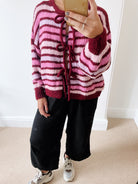 Wrap yourself in cosy comfort this autumn with our Striped Knitted Cardigan. Designed in a flattering one-size fit (UK 8–14), this ultra-soft knit features a chic tie-front and relaxed silhouette that suits a range of body shapes. The rich burgundy and soft pink stripes give off warm seasonal vibes, while the crisp white trim collar adds a fresh, modern touch. Perfect for layering on chilly days or elevating your everyday style — it’s your new go-to for effortless autumn dressing.